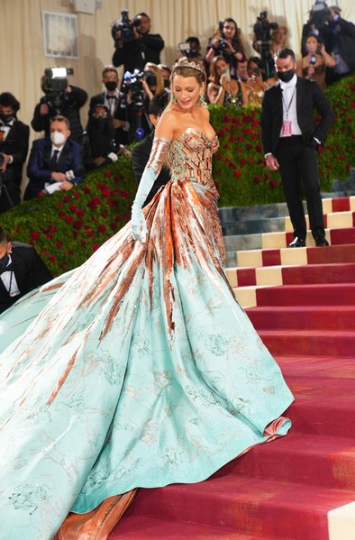 2022'nin Met Gala teması - "In America: An Anthology of Fashion" ve "Gilded Glamour" kıyafet kuralı için Lively, New York City'den ilham alan bir Atelier Versace elbisesi giydi. İlk başta, aktris kırmızı halıda, Empire State Binası'na ve New York'un karmaşık mimarisine saygı duruşunda bulunan, abartılı bir fiyonkla parıldayan pembe altın rengi bir elbiseyle yürüdü.