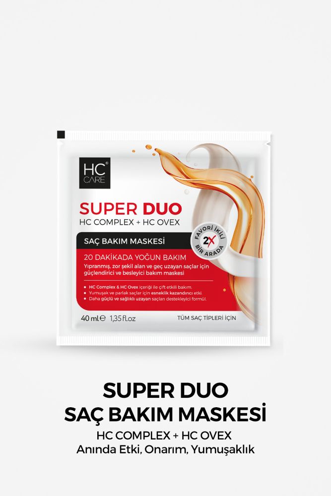 HC Care’in çift etkili efsanesi HC Super Duo Saç Maskesi, sadece 20 dakikada saçları yoğun şekilde besliyor ve yumuşatıyor. HC Complex ve Ovex içerikleri sayesinde kuru, zor şekil alan ve geç uzayan saçlara parlaklık kazandırıyor, saçların daha canlı görünmesine yardımcı oluyor. Düzenli kullanımda saçlar daha güçlü, esnek ve kolay şekil alan bir yapıya kavuşuyor.