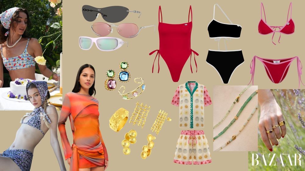 Soldan sağa alt: Bandana ve bikini takımı – Friday Bunny; Pareo – Khela; Renkli taşlı küpe ve bilezik – Swarovski; Altın yüzük ve küpeler – Sacré İstanbul; Bohem takım – Sandshaped; Kolye ve yüzükler – Les Clementine.