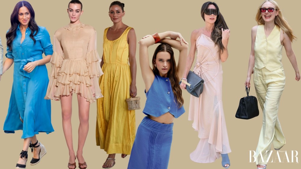 Soldan sağa: Meghan Markle; Drapeli elbise – Donne; Olivia Palermo; Mavi keten yelek etek takım – Aura Bea; Victoria Beckham; Dakota Fanning.