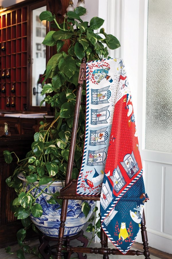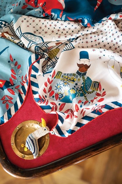 Tasarımların desenleri için Pınar ve Deniz ayrı ayrı Splendid'de zaman geçirip, onlara ilham veren desenleri otelde çizdiler. Benimle desenlerde neler olmasını istediğim konusunda fikir alışverişi yaptılar. Başından beri kubbelerin, bisikletli insanların, köpek ve kedilerin, özellikle de martıların olmasını istiyordum ama doğrusu Kazım Paşa'yı hiç düşünmemiştim. Tamamen Rumisu tarafından ortaya atıldı ve o kadar tatlı oldu ki, sanırım en sevilen karakter o olacak. Kazım Paşa ile ilgili komik bir anekdot da var; babama çizimleri ilk gösterdiğimde biraz bozuldu, "Benim paşa dedem sarışın, mavi gözlü bir adammış, burada kapkara sakalları var" diye söylendi. Bu yüzden son dakikada sakalların rengini değiştirdik! Desenler nispeten kolay ortaya çıktı ve fikirlerimiz çok paralel ilerledi. Rumisu o kadar profesyonel ki, benim için birçok şey çok çabuk ve keyifli oldu. En zor bulduğum bölüm fular ve bandanaları renklendirme süreciydi ama sonuç bence harika! Bu sene için üç fular, üç bandana renk kombinasyonu belirledik ama sezonlara göre farklı renkler üzerinde çalışmalar da yaptık. İleride farklı renk kombinasyonları çalışabiliriz. Ana rengimizin kırmızı kalması kaydıyla tabii. O, Splendid Kırmızısı.