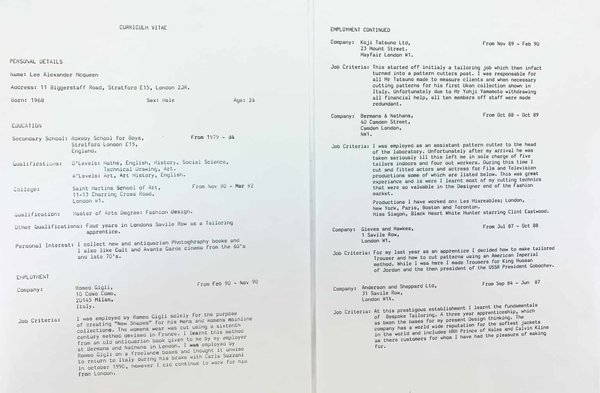 1992 veya 1993'te oluşturulduğuna inanılan, McQueen'in 24 yaşında hazırladığı özgün bir özgeçmiş, New York Uluslararası Antika Kitap Fuarı'nda satılacak. Fuar, 21-24 Nisan tarihleri arasında Yukarı Doğu Yakası'ndaki Park Avenue Armory'de gerçekleştirilecek.