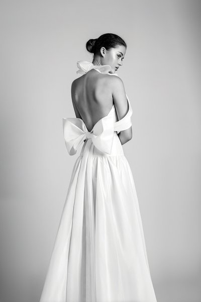 Öncekilerden çok farklı olduğunu belirterek başlamak isterim; dantel ve dekoltelerin yer aldığı çok seksi duruş yerine, çok daha yalın, sofistike bir siluete geçiş yaptım. İpekle çok çalıştım. Çok sade ve temiz ama bir o kadar güçlü bir görünüm var. Önceleri işlemeler ve detaylarla çok ilgilenirdim, bu yaz için hazırladığım gelinliklerde genel auraya dikkat ettim, klasik balo elbisesi değil, daha şık ve moda kokan elbiseler hazırladım.