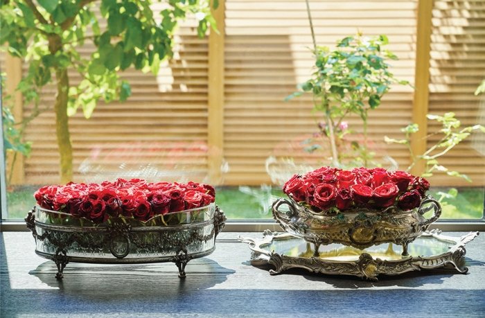 Esin kaynağım genelde çiçekler oluyor. Kırmızı güller, kırmızı antoryumlar, gelincikler sevdiğim çiçekler olduğu için bu seferki dekorasyonun aksesuarları hep kırmızı. Kendi evim olduğundan bu yana, annemin hediye ettiği, anneannem ve dedemden yadigar jardinyer, meyvelik ve bronz kupalar benimle birlikte gittiğim her yere taşındılar. Evimin en özel yeri ise misafir tuvaleti oldu. Gelincik formundaki lavaboyu Emine'm kendi elleri ile Ayvalık'taki atölyesinde üretti.