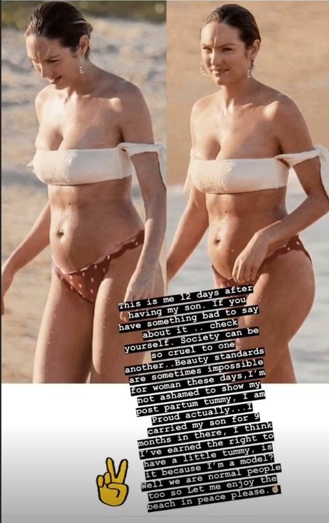 Swanepoel "Bu doğum yaptıktan 12 gün sonraki halim. Eğer söyleyecek kötü bir şeyiniz varsa kendinize bakın. Toplum bazen birbirine karşı zalim olabiliyor. Bu günlerde güzellik standartları kadınlar için imkansız hale geldi. Ben doğum sonrası karnımı göstermekten utanmıyorum. Aslına bakarsanız bundan gurur duyuyorum. Oğlumu tam 9 ay orada taşıdım. Sanırım biraz göbekli olmaya hak kazandım. Bütün bunlar ben bir model olduğum için mi? Evet, biz de normal insanlarız. O yüzden bırakın plajdan huzur içinde keyif alayım."