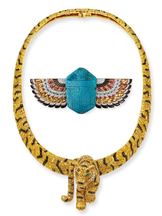Antik mavi fayans ve değerli taşlarla süslü Scarab broş, 1925 yılından - Sarı pırlanta ve oniksli sarı altın Tiger kolye, 1986 tarihli