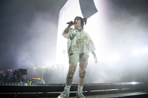 Billie Eilish, grafiti baskılı bir tişört ve ona uygun şort giyerek performans sergiledi.