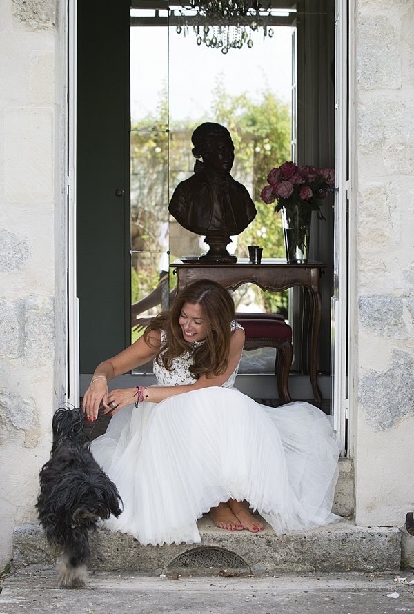 Cordelia de Castellane, Paris'in hemen dışındaki kır evinin girişinde, Christian Dior elbisesi ve köpeklerinden biriyle