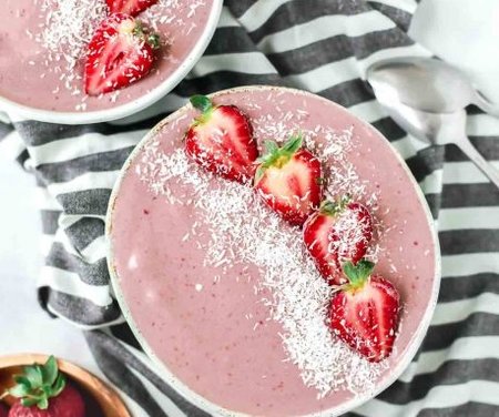 Dondurulmuş muz, donmuş çilek ve hindistan cevizi sütünü bir karıştırıcıda iyice karıştırın. Tamamen pürüzsüz olana kadar püre haline getirin. Elinizdeki karışım çok da akışkan olmamalıdır. Tamamen pürüzsüz hale gelmesi için gerekirse biraz daha hindistancevizi sütü ya da yağı ekleyin. Bir kaseye aktarın ve istediğiniz gibi malzemelerinzle süsleyin.