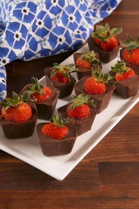 Çilekleri yıkayıp, saplarını temizleyin ve kağıt havlu yardımıyla iyice kurulayın. Çikolatayı küçük parçalara bölüp, cam bir kaseye koyun. Cam kaseyi, içine iki parmak dolusu su koyduğunuz bir tencerenin üzerine oturtun ve çikolatanın benmari usulü erimesini sağlayın. Küp çikolata kalıbı veya buz kalıbını kuru bir bezle silerek içine eriyen çikolatadan doldurun ve kalıbı ters çevirerek fazla çikolatanın geri akmasını sağlayın. Her bölmenin kenarları çikolatayla kaplandıktan sonra buzdolabında 10 dakika bekletin. Sürenin sonunda kalıbı dolaptan çıkarıp her bölmenin içine bir bütün çilek yerleştirin ve tekrar erittiğiniz çikolatadan dökerek kalıpları doldurun. Kalıpların tabanını dikkatlice 3-4 kez tezgaha vurarak hava boşluklarının dolmasını sağlayın. Buzdolabında donana dek dinlendirin. Daha sonra kalıpları ters çevirerek çikolataları çıkarın ve servis yapın.