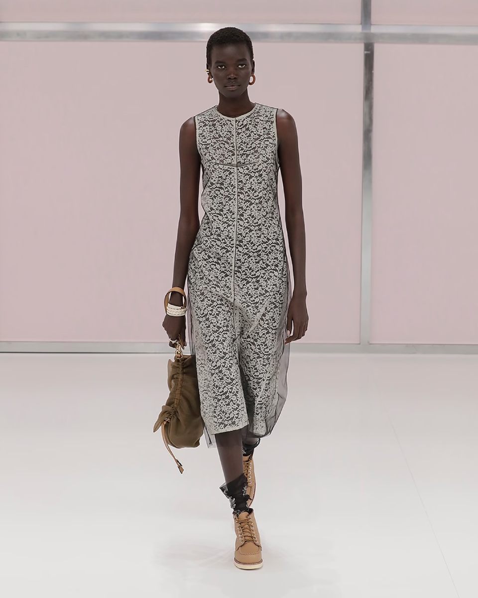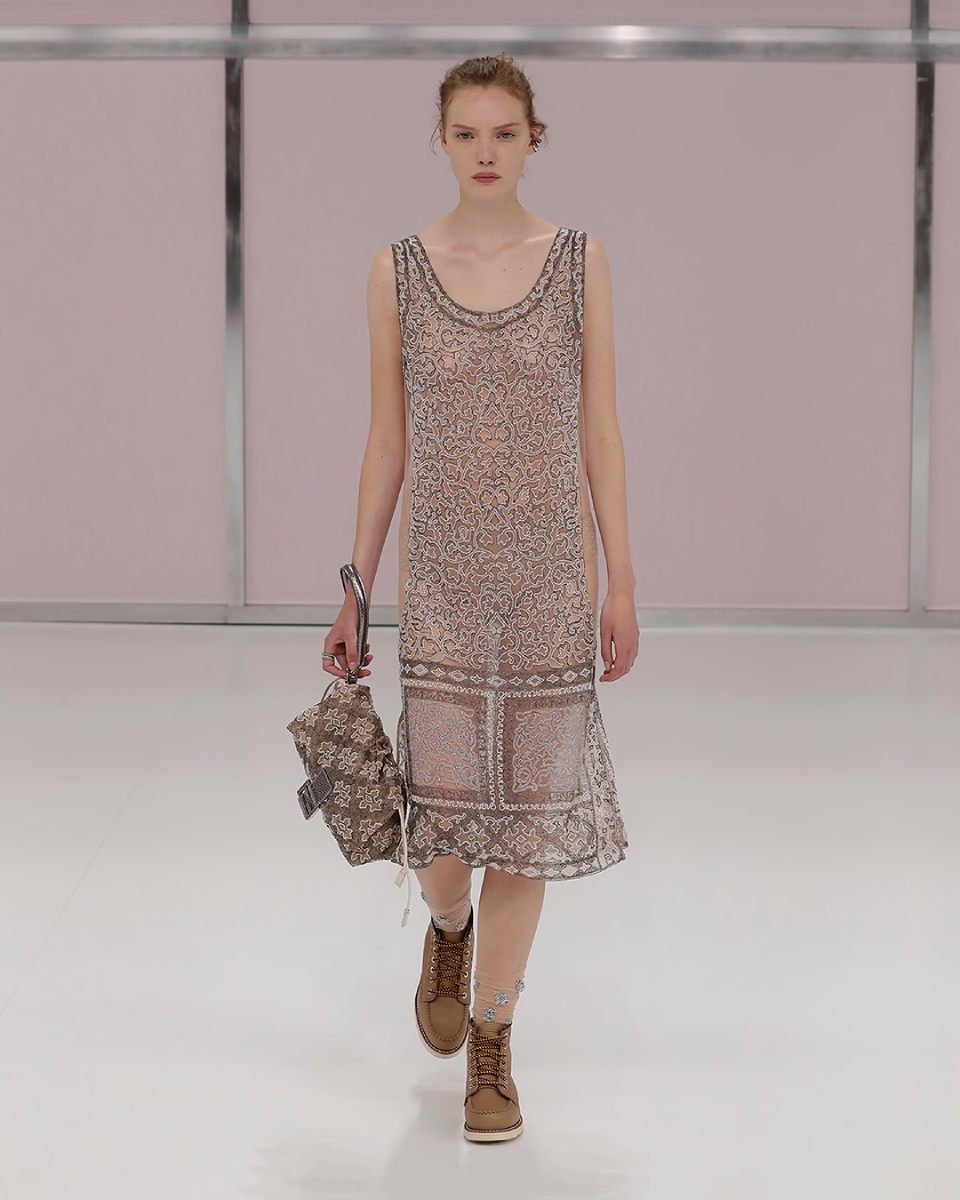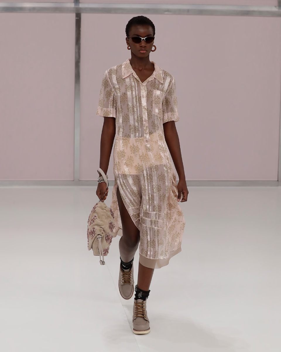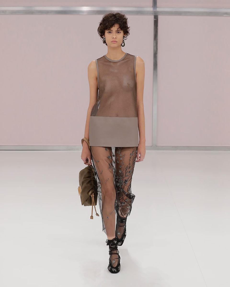 Fendi 2025 İlkbahar/Yaz koleksiyonu, markanın 100 yıllık mirasına saygı duruşu niteliğinde. Kim Jones, Fendi’nin tarihini şekillendiren dört nesil kadını onurlandırarak, 1920'lerin caz çağı modernizminden ilham alan ince işçilikli parçalar sundu. Düşük bel elbiselerden minimalize edilmiş silüetlere, Art Deco motiflerinden püsküllü etek uçları olan şeffaf flapper elbiselerine kadar geniş bir yelpaze sunan koleksiyon, klasik ve modern öğeleri bir araya getiriyor. Nötr tonlarda renk paletine sahip koleksiyon zarafetiyle öne çıkıyor.