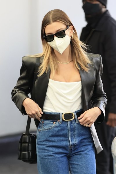 Sakinleştirici bir renk içinde geniş paçalı pantolonlarla eşleştirilmiş keskin omuzlu ceket Magda Butrym imzalı. Bieber, son zamanlarda siyah deri blazer ve büyük boy kot pantolonlar da dahil olmak üzere pek çok kez Polonyalı tasarımcının imzasını taşıdı. Butrym, 1980'lerin şekillerine, 1990'ların şık kumaşlarına ve renklerine bir saygı duruşu niteliğindeki görünümüyle eş anlamlı hale geldi. Emily Ratajkowski ve Irina Shayk da aynı zamanda geniş omuzları ve ince belleri olan gösterişli ceketlerinin ve elbiselerinin de hayranı.
