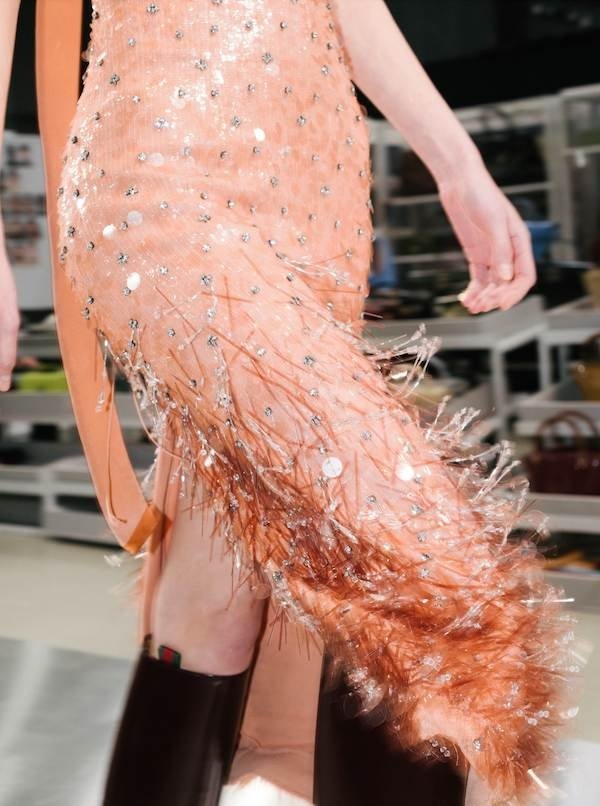 De Sarno, 2024 Sonbahar koleksiyonu hakkında konuşurken, onu oluşturma aşamasında yardımcı olan pek çok insanı büyük bir saygıyla anıyor. "Çalıştığım tüm insanlarla konuşmak benim için her zaman ilham verici," diyor. "Gucci'de uzun yıllardır çalışan bazı insanlardan farklı bakış açılarını öğrenmek önemli. Bu insanların geçmişi ve deneyimleri önemlidir." Özellikle, ayakkabı tasarımında çalışarak şirkette 40 yıldan fazla süredir bulunan bir kadından bahsediyor ve arşivden elde ettiği her şeyin güncellendiğinden, bugünün müşterisi için değerli bir şeye dönüştüğünden emin olmak için önemli bir rol oynadığını söylüyor. Örneğin; tereyağı kıvamında yumuşak deriden tasarlanmış ve topuğunda demirden Gucci Horsebit amblemiyle süslenmiş yeni uzun binicilik botu. Backstagede bazı modeller onları çoktan giymiş, çok sevdiklerini ve ne kadar rahat olduklarını konuşuyorlar.