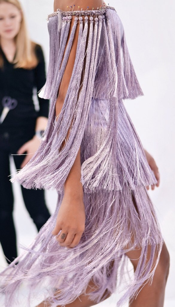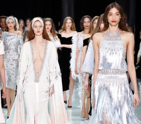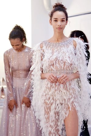 Drama! Son dört yıldır Haute Couture haftasına katılan Londralı Ralph & Russo'nun bu sezonki felsefesi ancak böyle özetlenebilir. Türbanı andıran saç aksesuarları ve uçuşan şifonlarıyla bir Hollywood yıldızı düşleyen Tamara Ralph ve Michael Russo, markanın kırmızı halı akinlerinden oluşan hayran kitlesini hayal kırıklığına uğratmamaya kararlıydı. Angelina Jolie ve Meghan Markle ile anılarak bulutların ötesinde bir popülarite yaşayan marka, bu kadar tanınır olmasının ilginç bir tehdidiyle karşı karşıyaydı; şu elbisesinin bir benzerini Zendaya'nın üzerinde, peki ya şu kristal işlemeli olanı Bella Hadid'de zaten görmemiş miydik? Acaba bunlar klasikleri revize etmek olarak görülebilir miydi, yoksa bir kendini tekrar mıydı? Cevap değişir. Bu sezon ise Çarliston püsküllerinden kimono kesimlerine uzanan ilham dağarcığı ve referansları biraz fazla açılsa da, Ralph & Russo oldukça feminen ve zarif.