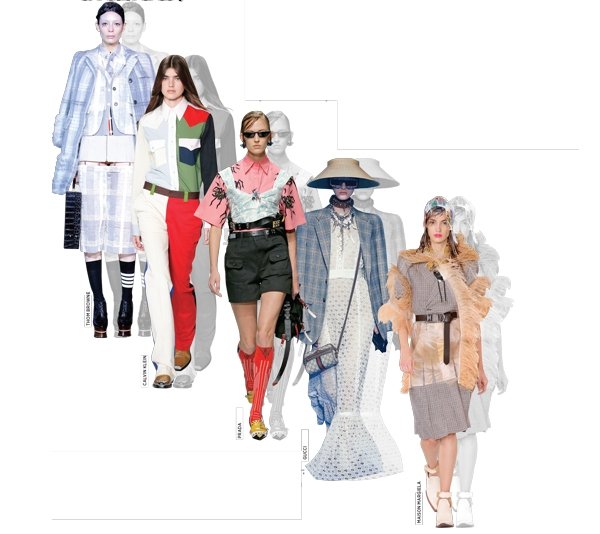 Farklı doku, renk ve desenlerin bir bütün oluşturduğu kombinler; Calvin Klein'da birbirlerine monte edilmiş hissi yaratan iki farklı gömlek ve pantolon görünümündeyken, Maison Margiela'da ekose üzerine geçirilen mini bir tül etek halini alıyor.
