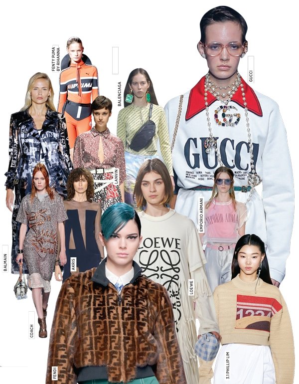 İlkbahar/Yaz 2018 sezonunda logo çılgınlığı devam ediyor. Fendi, 'F' logosunu kürk beyzbol ceketlerinin her yerinde geometri yaratmak için kullanırken; Max Mara logosu da elbise ve aksesuarların her köşesinde simetrik bir şekilde yer alıyor. Balenciaga, Emporio Armani ve Loewe gibi markalar ise klasik tişörtler üzerinde logolarını kullanarak bu sezon logo trendini sürdürüyorlar.