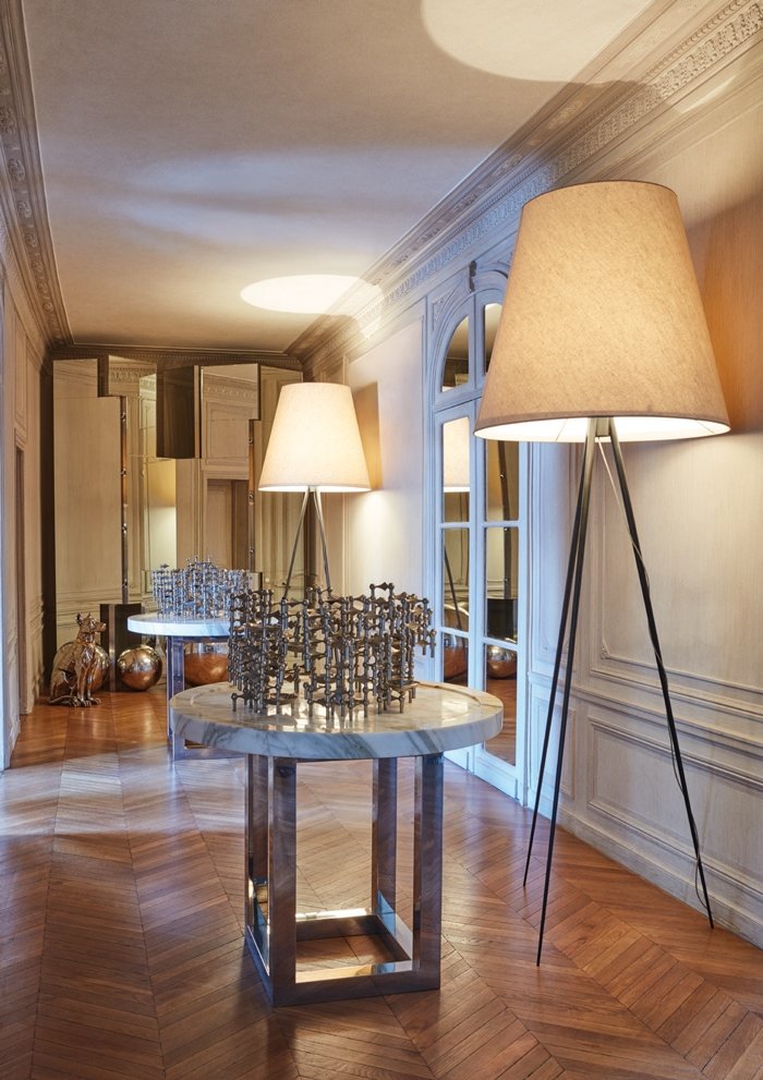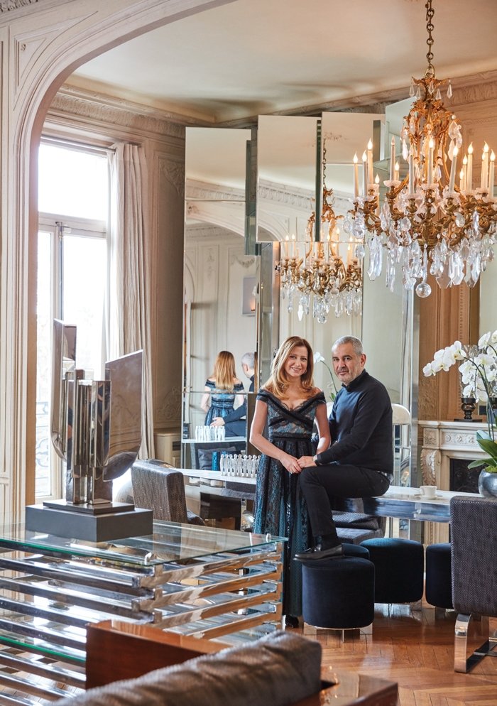 Paris'teki bu daire Saab estetiğinin dekorasyondaki yansıması niteliğinde: Modern detaylar içeren klasik lüks. 19'uncu yüzyıldan kalma kartonpiyerli yüksek tavanlar ve parke zeminler, onlara eşlik eden çağdaş tasarımlar ve siyah-dore ağırlıklı renk paleti etkileyici bir sentez oluşturuyor. Antreyi, Saab'ın ünlü Lübnanlı mimar Chakib Richani ile birlikte tasarladığı XL lambaderler aydınlatıyor. Yine Richani imzası taşıyan çelik ayaklı mermer sehpalar da dekorasyonun modern tonuna katkıda bulunuyor.