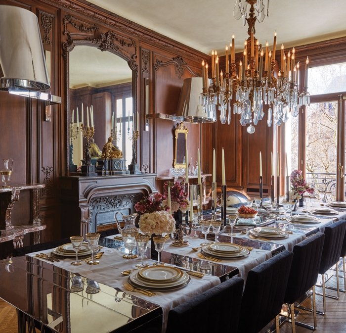 Elie Saab, yemek odasında, özel tasarım çelik masa ve İtalyan stili kadife sandalyelerin yanında