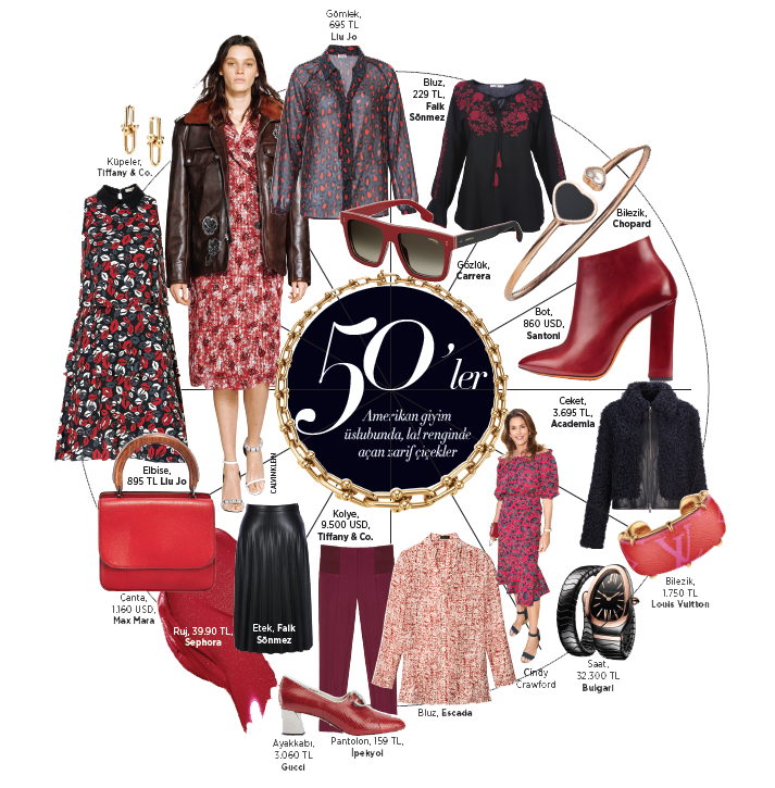 50'ler amerikan giyim üslubuna, lal renginde açan zarif çiçekler