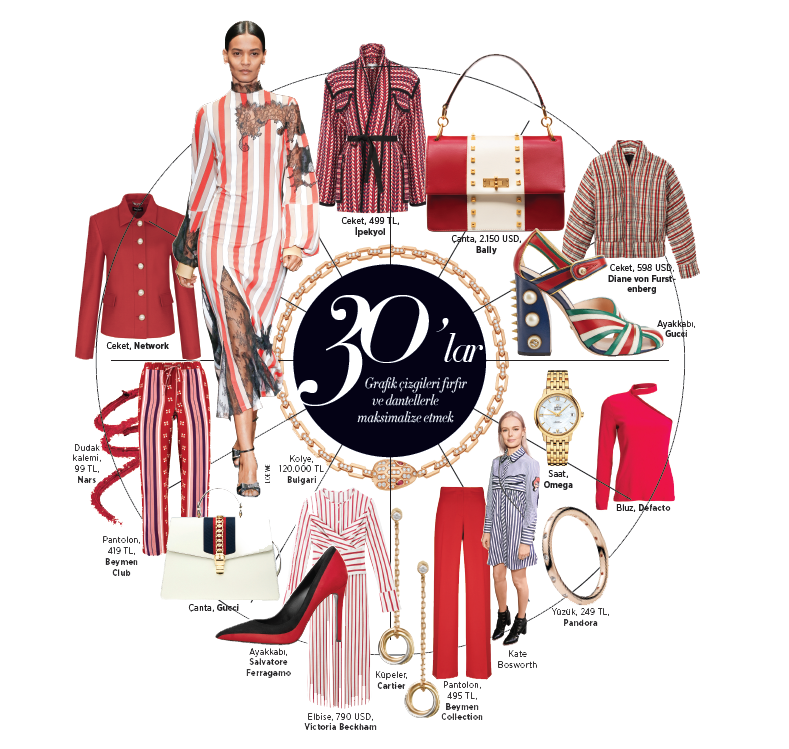 Şair gömlekleri ve pileli etekler bu sezonun kilit parçalarından. Büyük boyutlu kolye ve küpeler de… Tüm bunları siyah-beyaz renk skalasında buluşturmak ve silueti kalın topuklularla yükseltmek işin püf noktası.