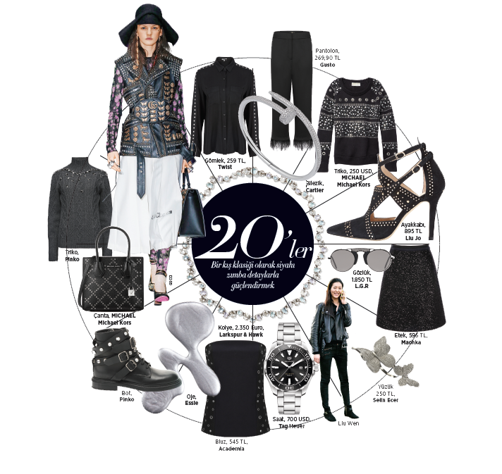 20'ler Bir kış klasiği olarak siyahın zımba detaylarla güçlendirmek.