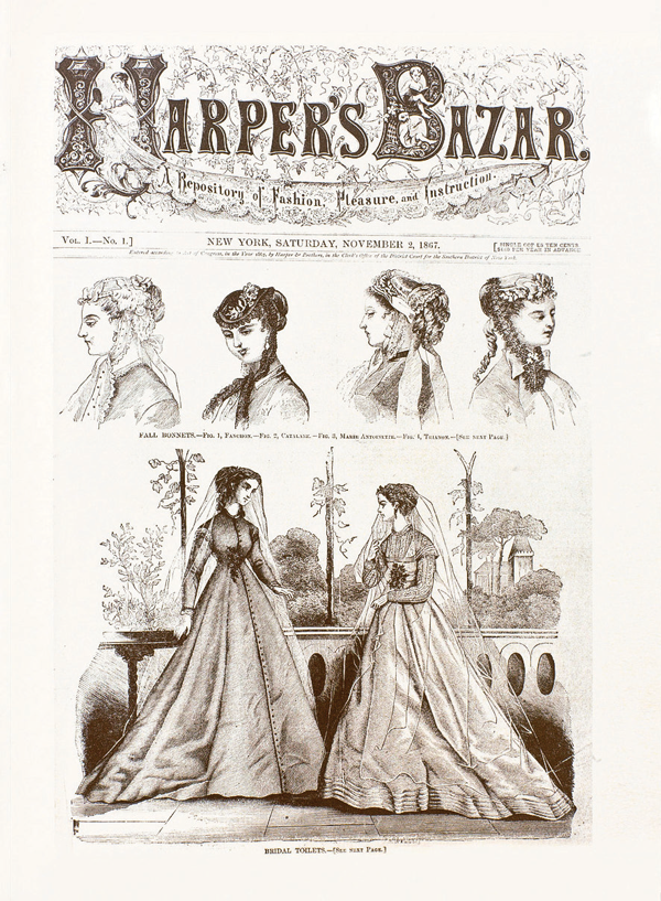 Harper's Bazaar'ın (O dönemki adıyla Bazar'ın) 2 Kasım 1867 tarihinde yayımlanan ilk kapağında, dönemin modasını şekillendiren Fransa Kraliçesi Eugénie'den ilham alan romantik bir tablo yer almıştı.