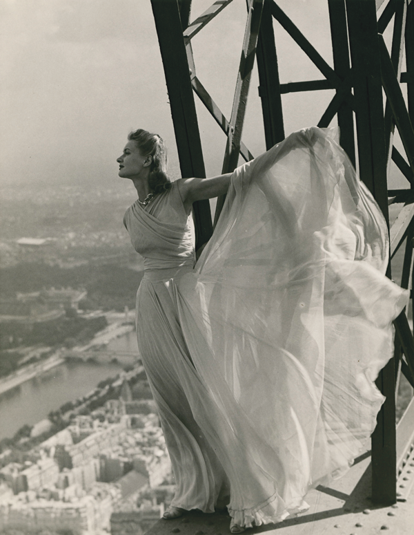 Erwin Blumenfeld'in Eylül 1939 sayısı için fotoğrafladığı model Lisa Fonssagrives, Eyfel Kulesi'nin tepesinde, söylentiye göre hiçbir yere bağlı olmadan poz veriyor.