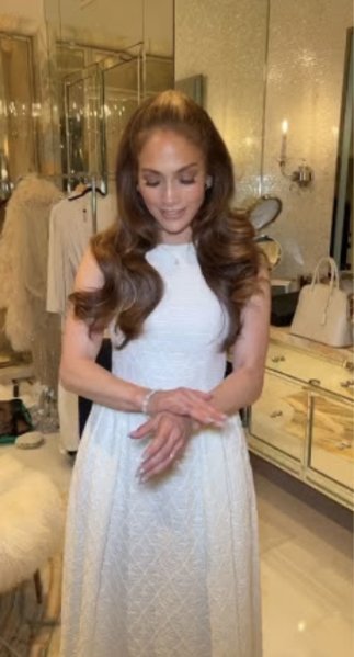 Özel fotoğraf ve videolarda Lopez, birini "eski bir filmden bir elbise" olarak tanımladığı iki farklı elbise giyiyor. Geleneksel beyaz kolsuz elbise, yüksek bir yakaya, vücuda oturan bir bele ve baştan sona zarif bir elmas desene sahip. Ünlü şarkıcı, gecenin bir bölümünde damadıyla birlikte görüldüğü başka bir fotoğrafta uzun dantel kollu bir elbise giydiği görünüyor.
