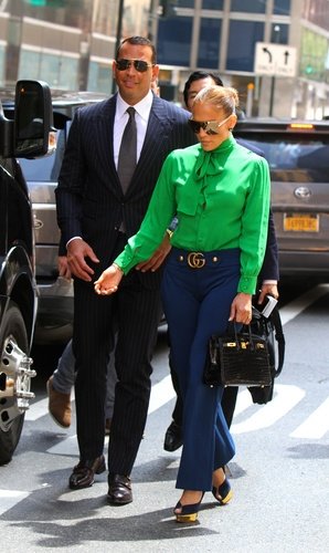 Jennifer Lopez ile sevgilisi Alex Rodriguez, önceki gün New York'ta görüntülendi. Pop divası Jennifer Lopez, Gucci yeşil bluzu ve mavi Gucci marka pantolonuyla şıklığını konuştururken, erkek arkadaşı Alex Rodriguez'in çizgili takım elbisesiyle ona uyum sağladı.