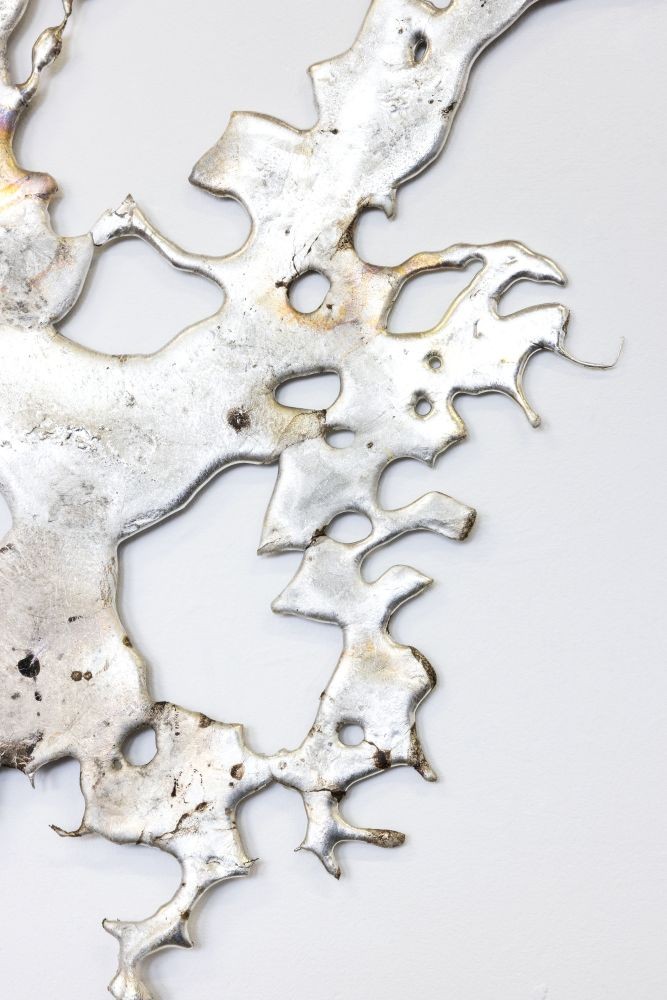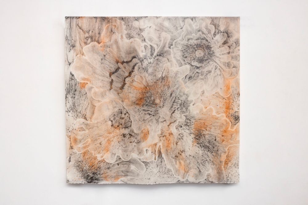 Süreç odaklı işler sarnıcın geçitlerinde devam ediyor. Bunlar arasında sanatçının “Hydromancies” serisinden, yarı saydam kâğıt üzerine su, pigment ve ateşin etkileşimiyle yarattığı narin çizimlerden oluşan yeni üretimler yer alıyor. Bu çizimler, hem gökyüzü haritalarını hem de el falı motiflerini çağrıştırıyor; hamam kültürüne ve hamamın banisi Barbaros Hayreddin Paşa’ya uzanan bilimsel ve mistik geleneklerle yankılanıyor. Minchin, kehanet amacıyla erimiş metallerle uygulanan kadim bir yöntem olan molybdomancy (kurşun dökme) pratiğinden de ilham alıyor. Sanatçının İstanbul’da ürettiği yeni kalay yerleştirmeler, sarnıcın uhrevi atmosferinde akışarak danteli andıran yansıtıcı formlara dönüşüyor. Kalaydan işlerin bazıları ise hamamın restorasyonuyla doğrudan diyaloğa giriyor, arkeolojik kazılarda gün yüzüne çıkarılan tarihi objelere gönderme yapıyor.