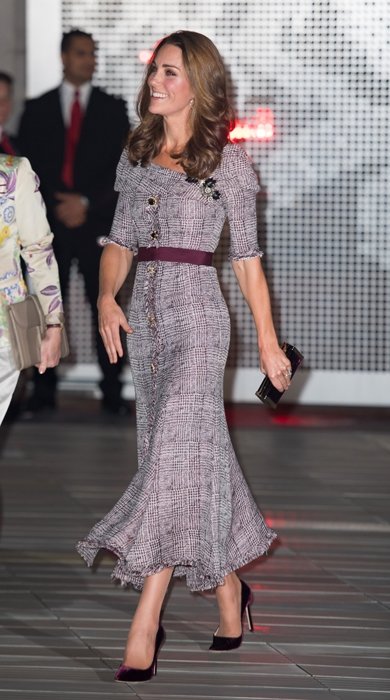 Son dönemin trendi ekose elbisenin göğüs kısmı için elmaslardan oluşan bir broş tercih eden Middleton, elbisesini bordo süet bir kemer, aynı renk ayakkabılar ve küçük bir çanta ile tamamladı.