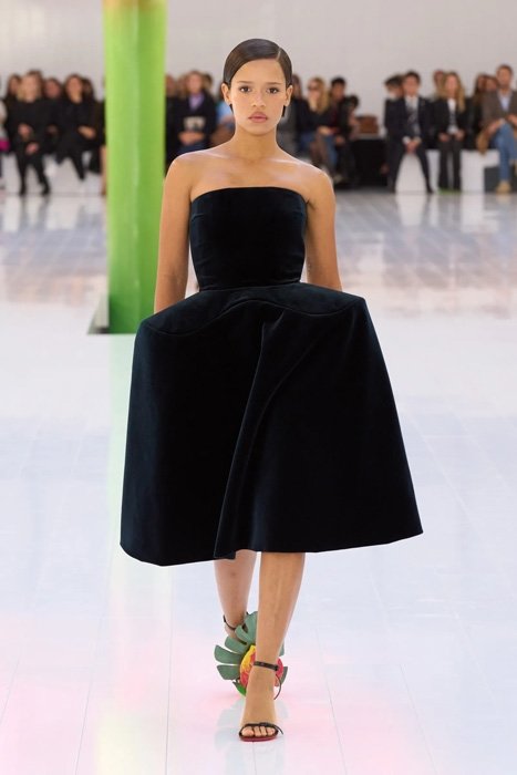 Tüm bunların arasında, Jonathan Anderson'ın inanılmaz bahar Loewe koleksiyonunu, askısız siyah kadife bir elbiseyle açmayı başardı. Ayaklarında: tek bir monstera yaprağı ve ayak parmaklarından filizlenmiş gibi görünen antoryum içeren bir çift topuklu ayakkabı.