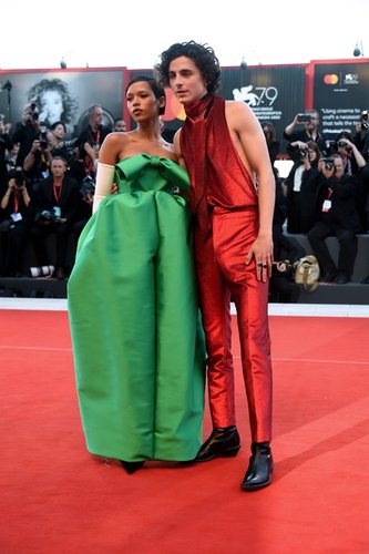 Chalamet, Venedik Film Festivali'nde özel yapım kırmızı Haider Ackermann kıyafetini giydiğinde Bones ve All filminin diğer başrolü Russell, Demna'nın ikinci Balenciaga haute couture koleksiyonundan bir görünümü seçti; önü uzun bir elbiseyi ve arkadan bir mini elbiseyi taklit eden Kelly yeşili straplez bir parça.
