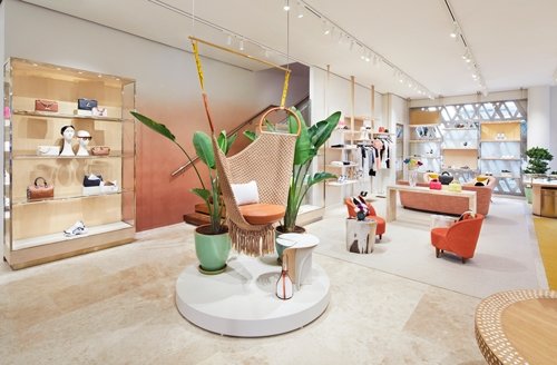 Louis Vuitton'un ikonik monogram deseninin bu mağazaya özel tasarlanan nazar boncuklarıyla dekore edildiği vitrinler, çok etkileyici bir giriş atmosferi yaratıyor. Mağazanın sıra dışı cephesi, derinlik ve perspektife dair mimari oyunlarıyla muazzam bir görüntü oluşturuyor. Cephede yer alan cut-out motifler, gün içinde ışığın mağazanın farklı noktalarına süzülmesini sağlıyor. Renkli el boyaması kabinler, deri detaylar, traverten yerler ve yumuşacık yün halılar bu ışık oyunlarıyla adeta dans ediyor.