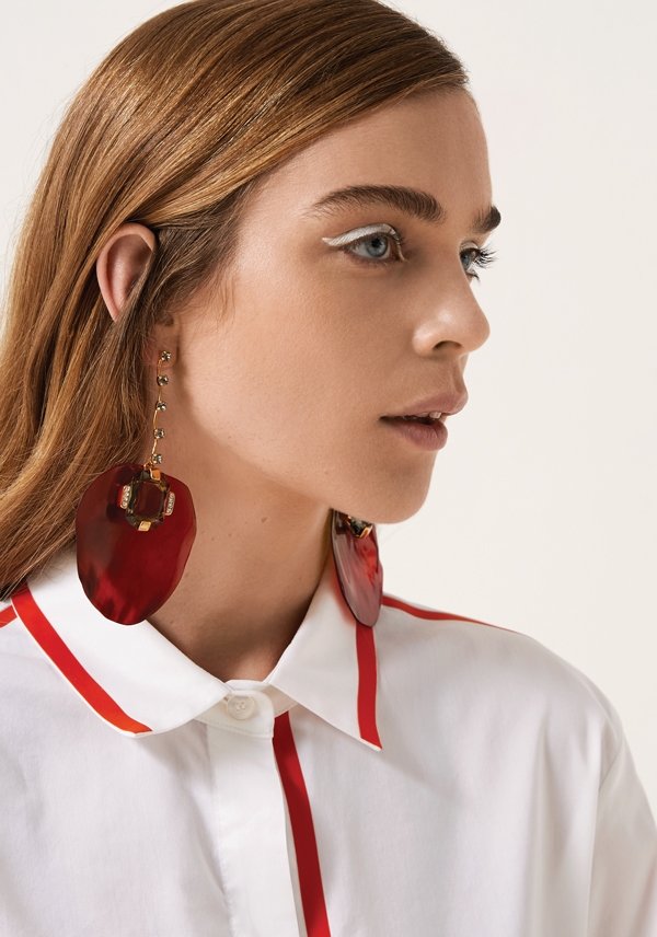 Biyeli beyaz gömleğinizi, tercihen biyenin renginde doğal taşlı sarkıt küpelerle tamamlayın. İdeal mesafe, omuz hizası.