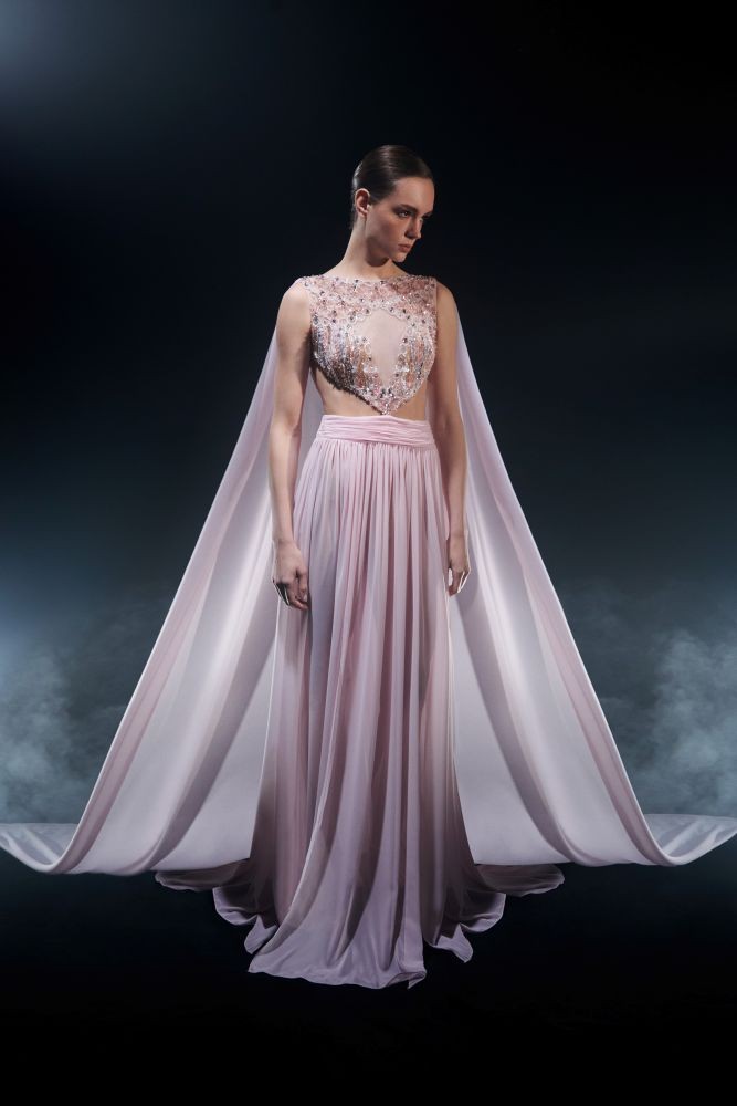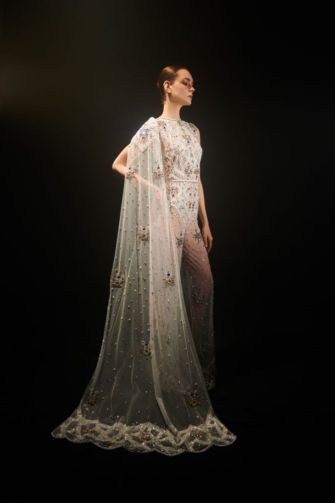 İpek, şifon ve krep gibi zarif kumaşların kullanıldığı koleksiyonda, kasnakta elde işlenmiş nakışlar couture ruhunu vurgularken, pastel tonlar ile siyahın asil dengesi güçlü bir görsel dil sunuyor. Büstiyerlerden pantolonlara, tulumlardan pelerinli elbiselere kadar her parça, modern kadının çok yönlü yaşamına eşlik edecek nitelikte tasarlandı.