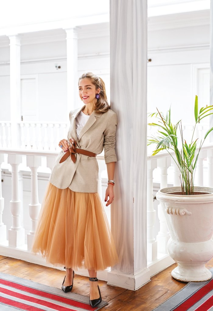 Kendi proporsiyonumdan ötürü ara boy etekleri, ayak bileğini öne çıkaracak kesimleri çok seviyorum. Katmanlı kombinlemeyi seviyorum. Üstelik renk konusunda cesur olmak da gerekiyor. Desenleri karıştırmak da tatlı bir hile. Keten düz
