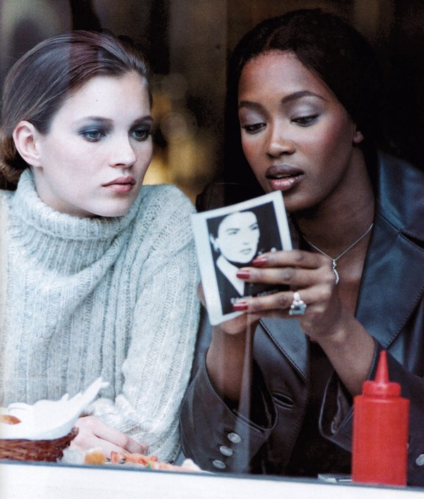 Peter Lindberg'in Aralık 1994 sayısı için fotoğrafladığı moda çekiminde Kate Moss APC triko, Naomi Campbell Prada deri ceketle