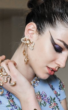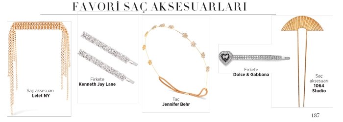 "Aksesuarlarla gelin saçını şıklaştırmayı seviyoruz. Özel bir mumlama teknolojisi ile doğal çiçeklerle tasarlanan volümlü floral taçları tercih ediyoruz. Bu taçtan rol çalmamak için saç düşük bir at kuyruğu ile tamamlanabilir."