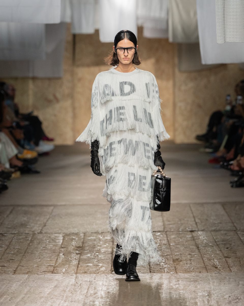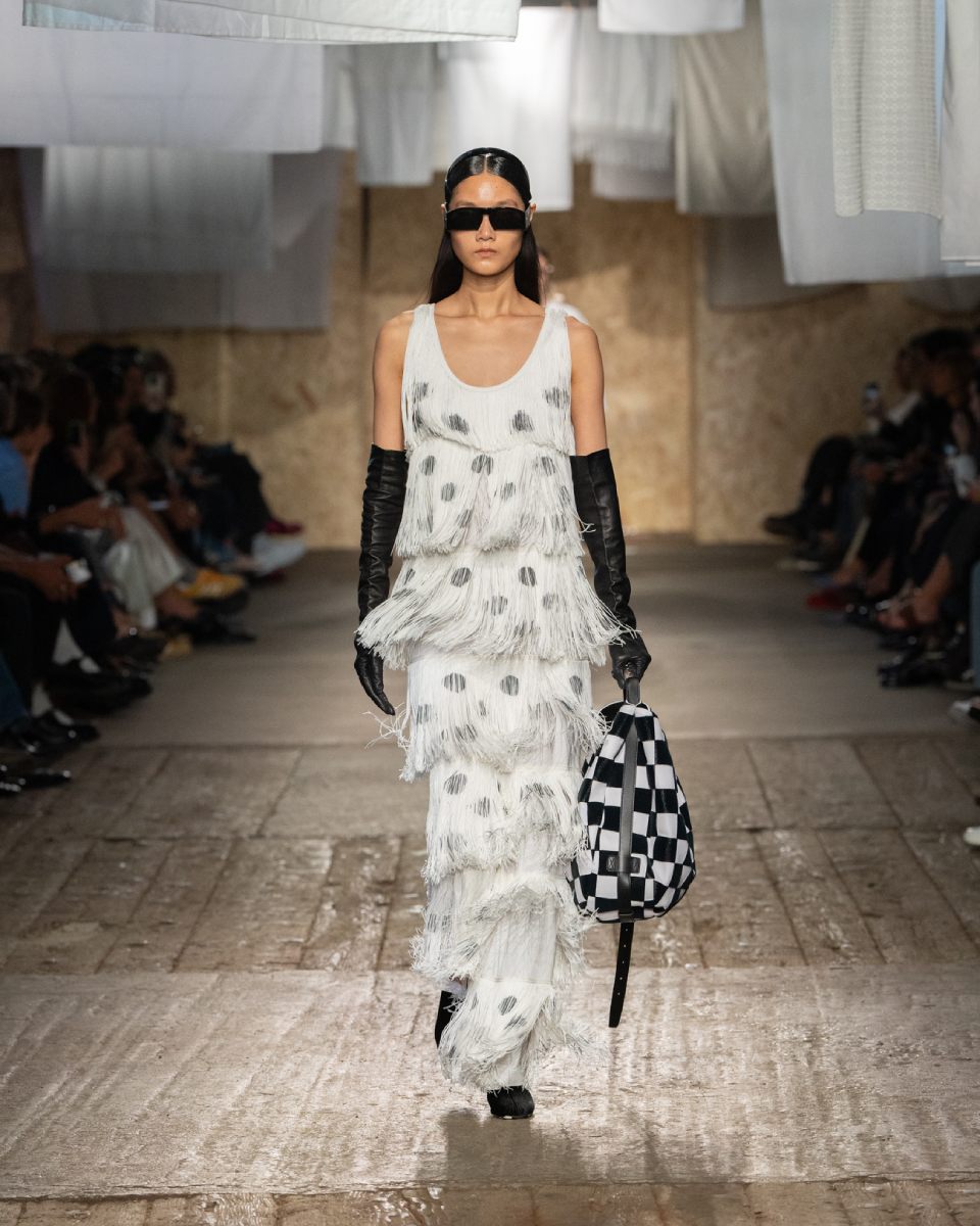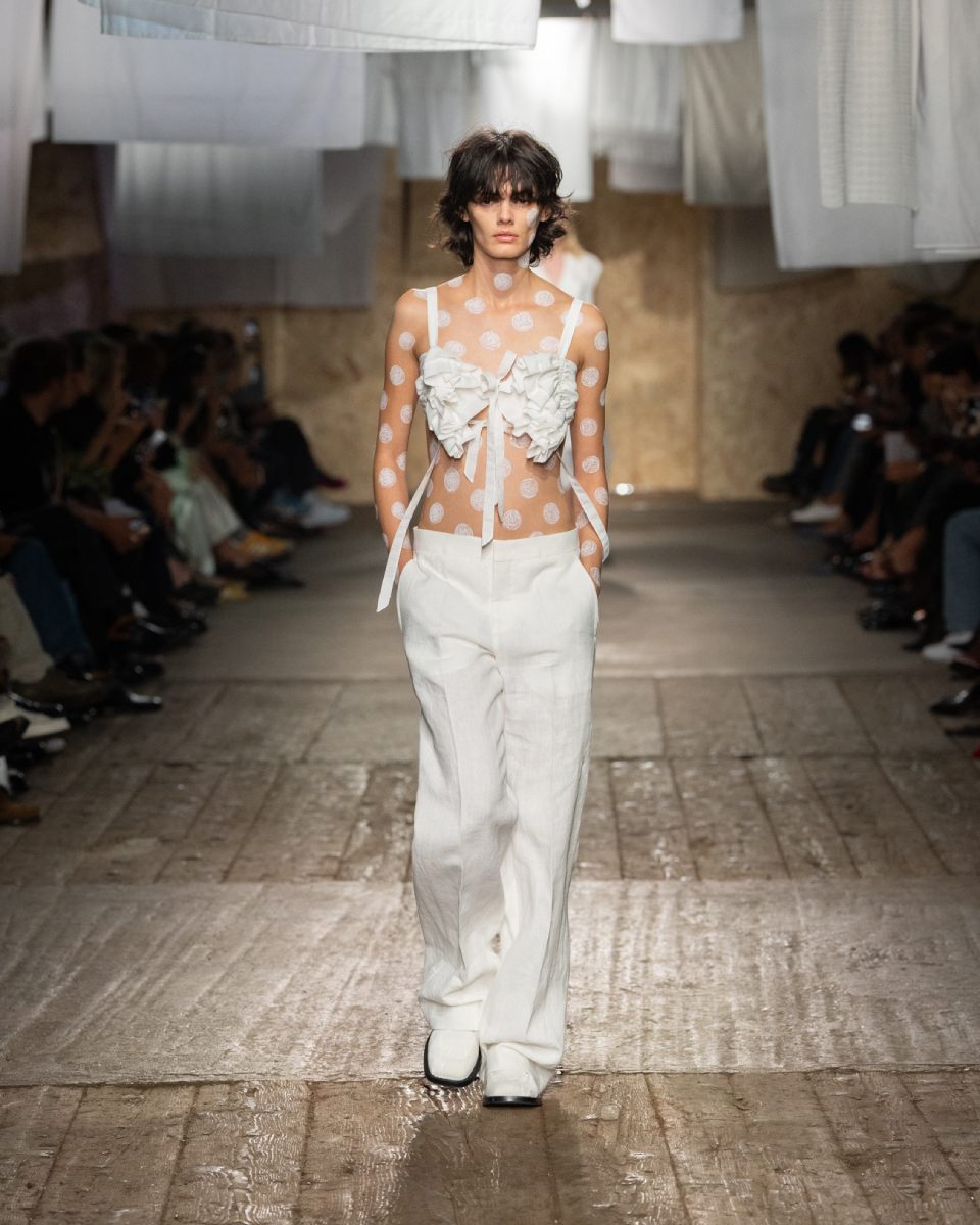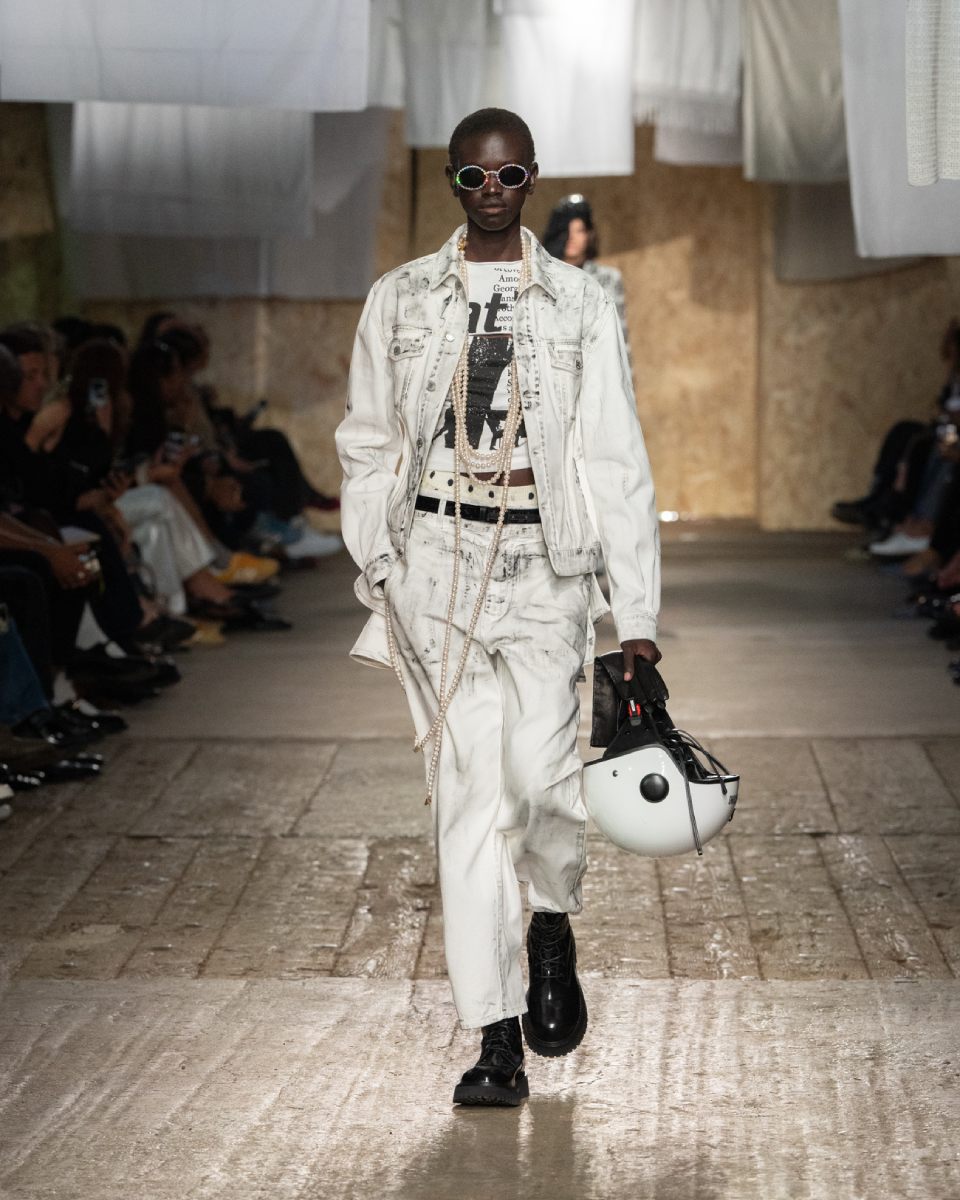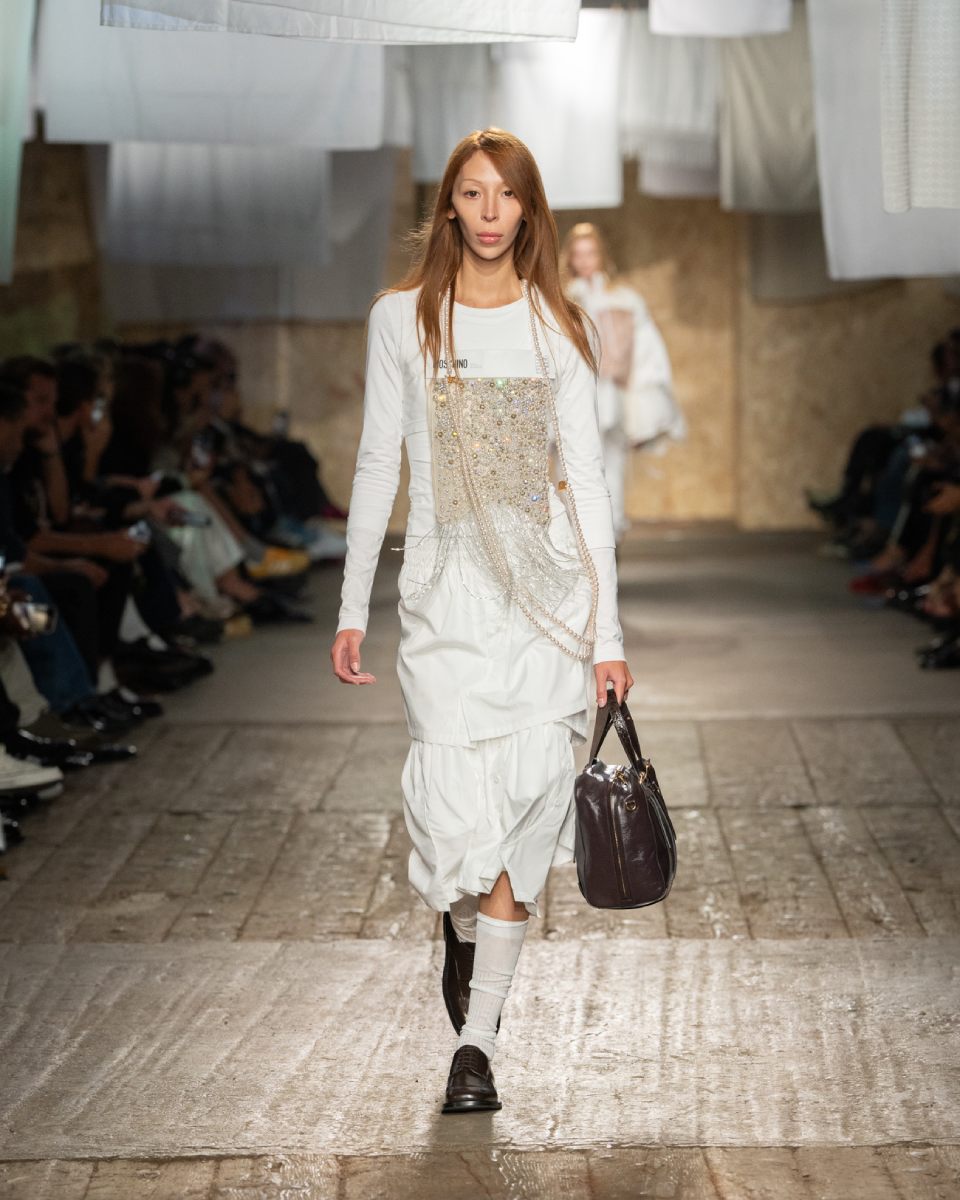 Moschino 2025 İlkbahar/Yaz Koleksiyonu, Adrian Appiolaza'nın üçüncü sezonunda, Franco Moschino’nun mirasını 21. yüzyıl izleyicisi için yeniden yorumladığı, alt kültürel moda gruplarını inceleyen bir koleksiyon olarak karşımıza çıkıyor. Beyaz görünümlerle başlayan defilede, drapeli silüetler, çizgili trikolar, dantel slip elbiseler ve Judy Blame’den ilham alınan aksesuarlar öne çıkıyor. Appiolaza'nın geniş vizyonu, moda dünyasında eğlence ve iyimserlik arayanlara cesur ve dikkat çekici bir stil sunuyor.