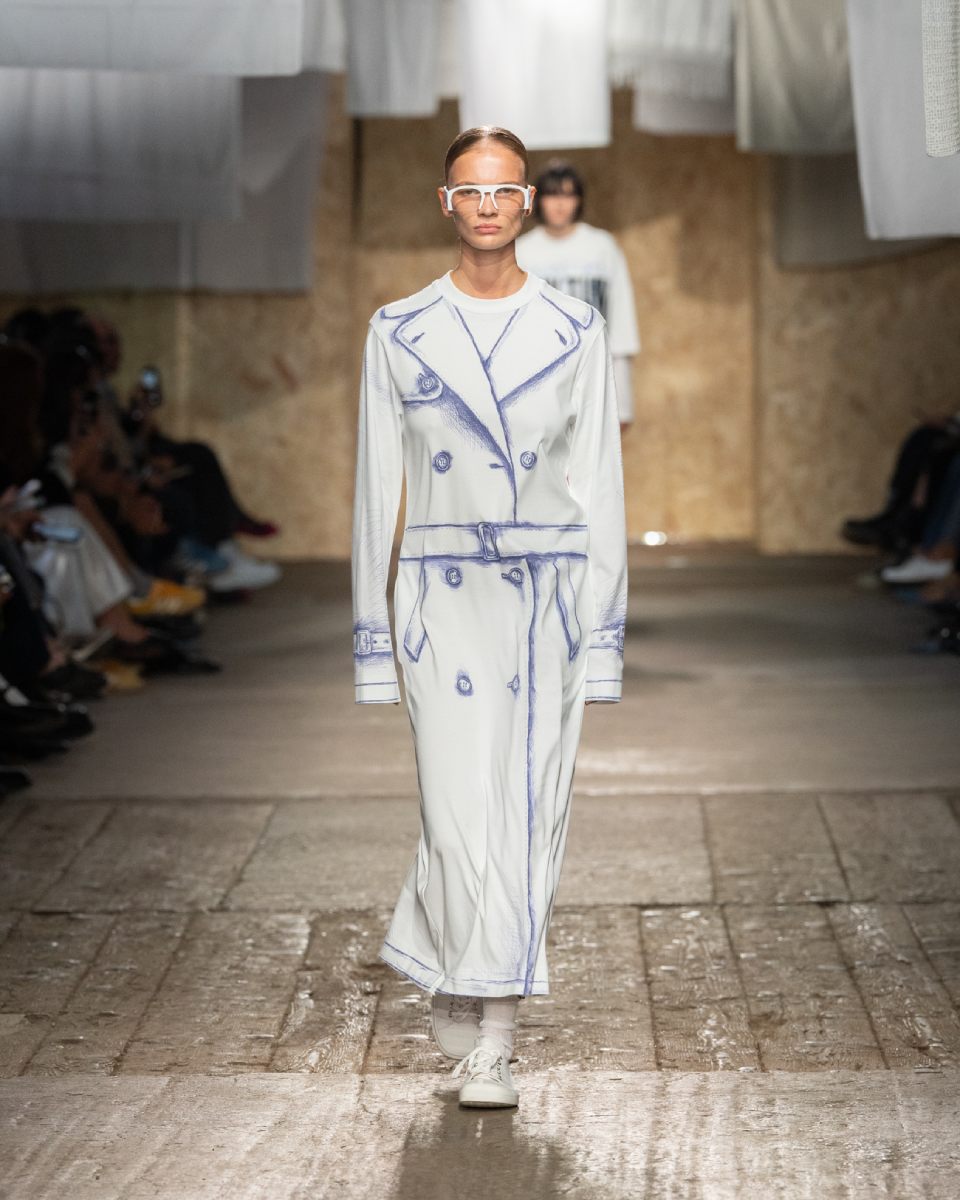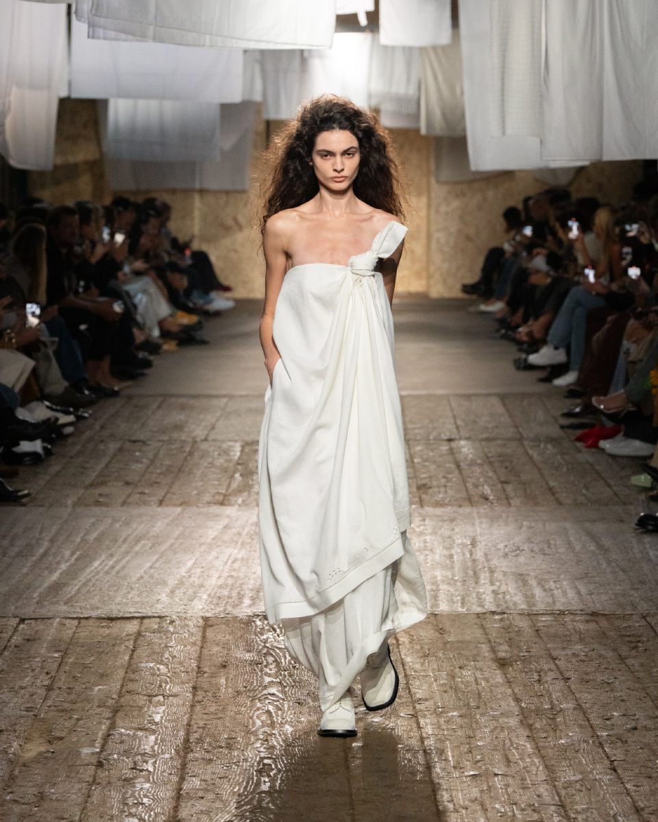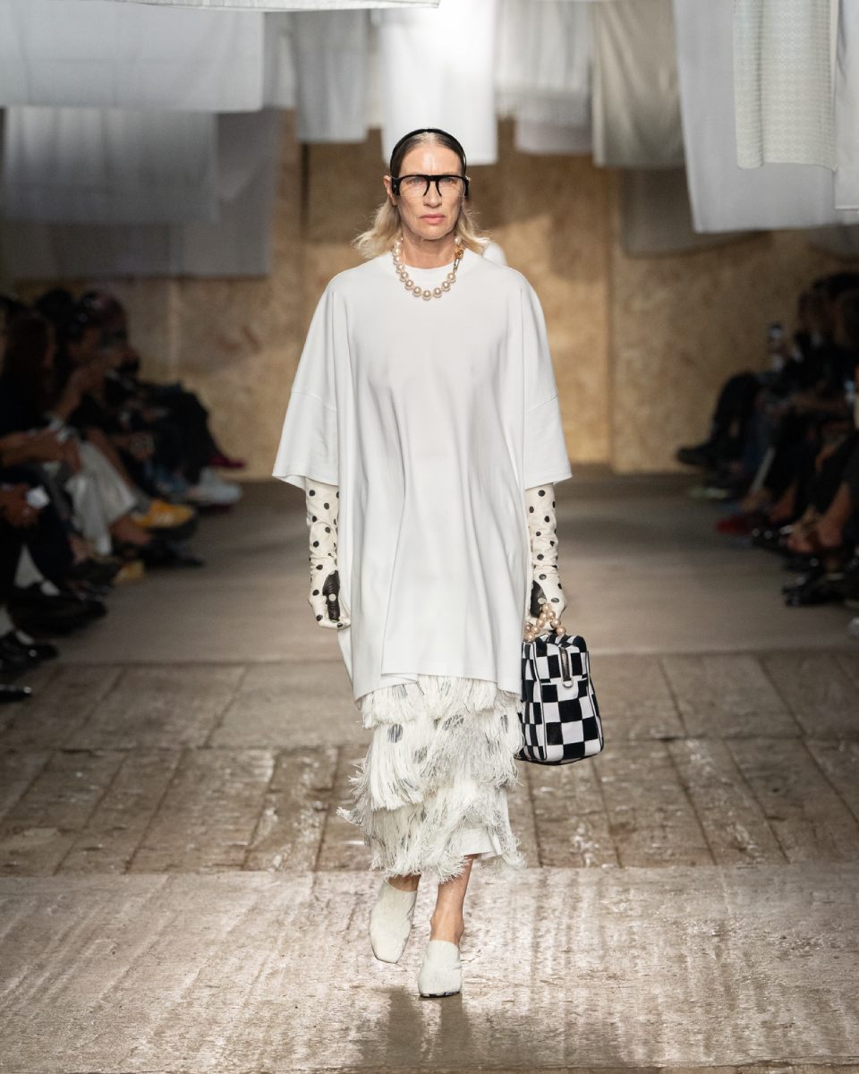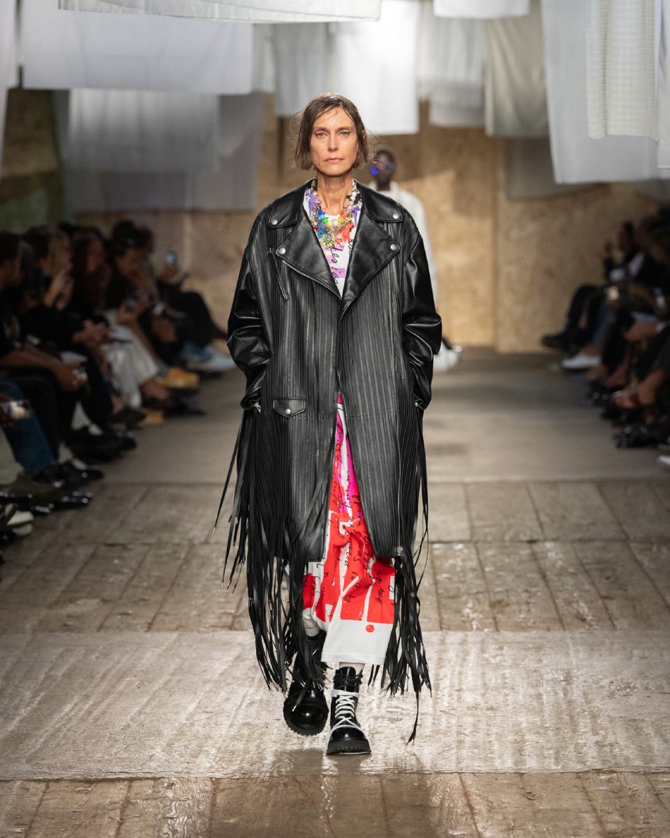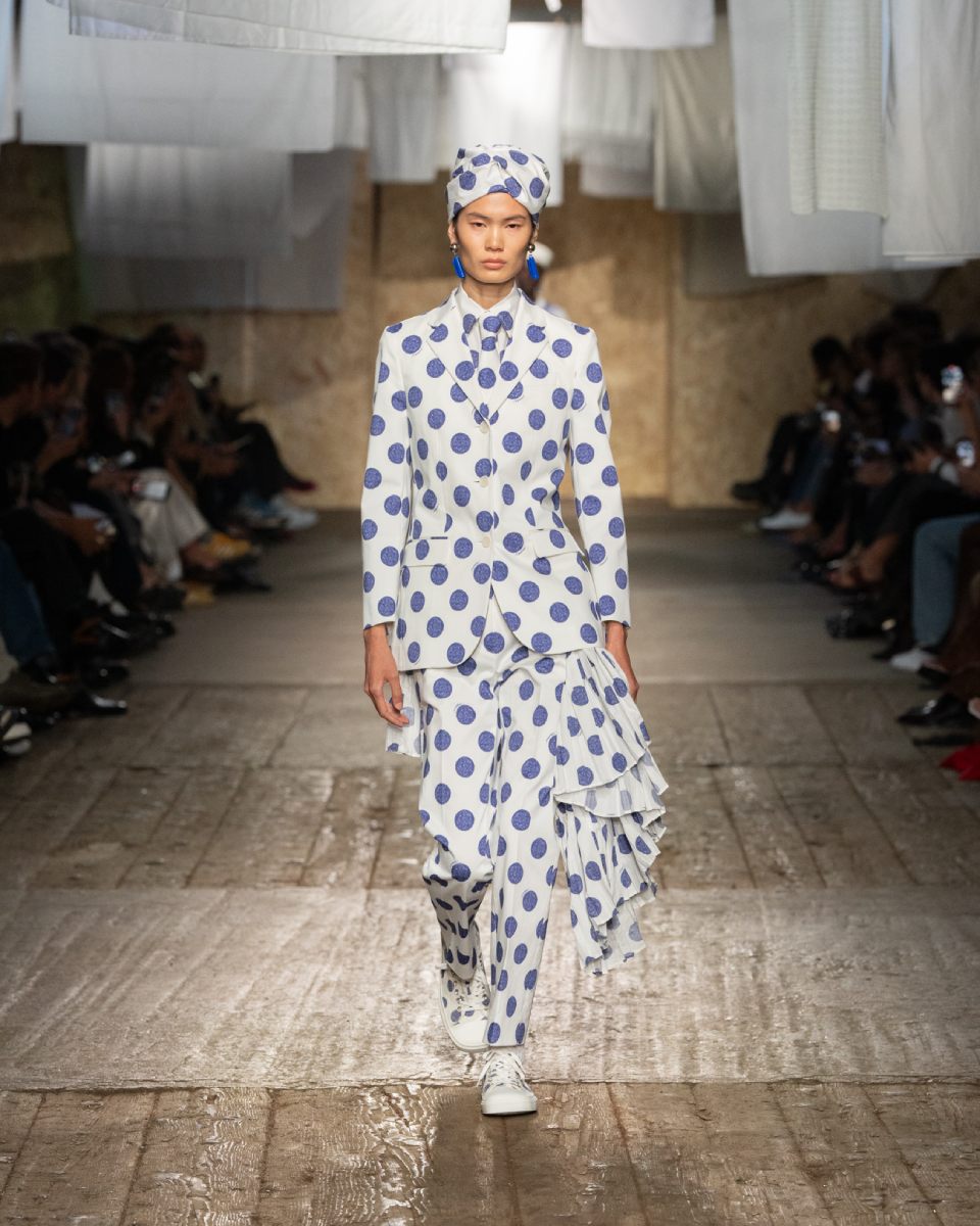Moschino 2025 İlkbahar/Yaz Koleksiyonu, Adrian Appiolaza'nın üçüncü sezonunda, Franco Moschino’nun mirasını 21. yüzyıl izleyicisi için yeniden yorumladığı, alt kültürel moda gruplarını inceleyen bir koleksiyon olarak karşımıza çıkıyor. Beyaz görünümlerle başlayan defilede, drapeli silüetler, çizgili trikolar, dantel slip elbiseler ve Judy Blame’den ilham alınan aksesuarlar öne çıkıyor. Appiolaza'nın geniş vizyonu, moda dünyasında eğlence ve iyimserlik arayanlara cesur ve dikkat çekici bir stil sunuyor.