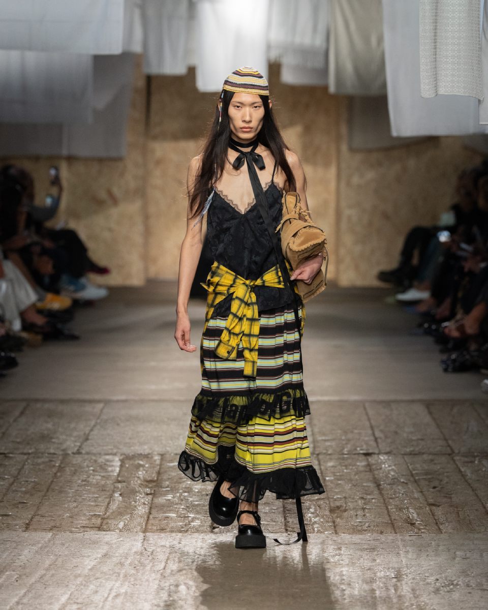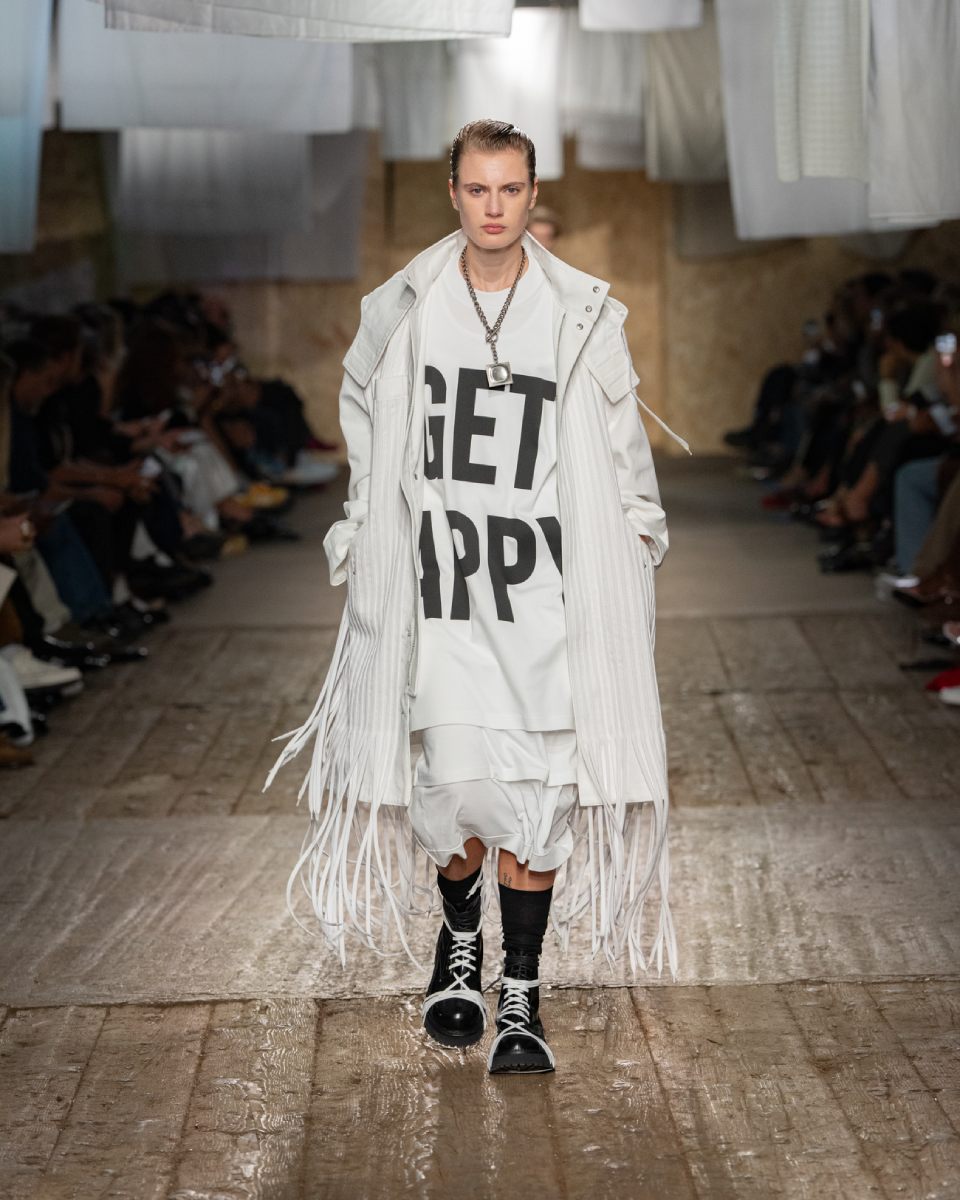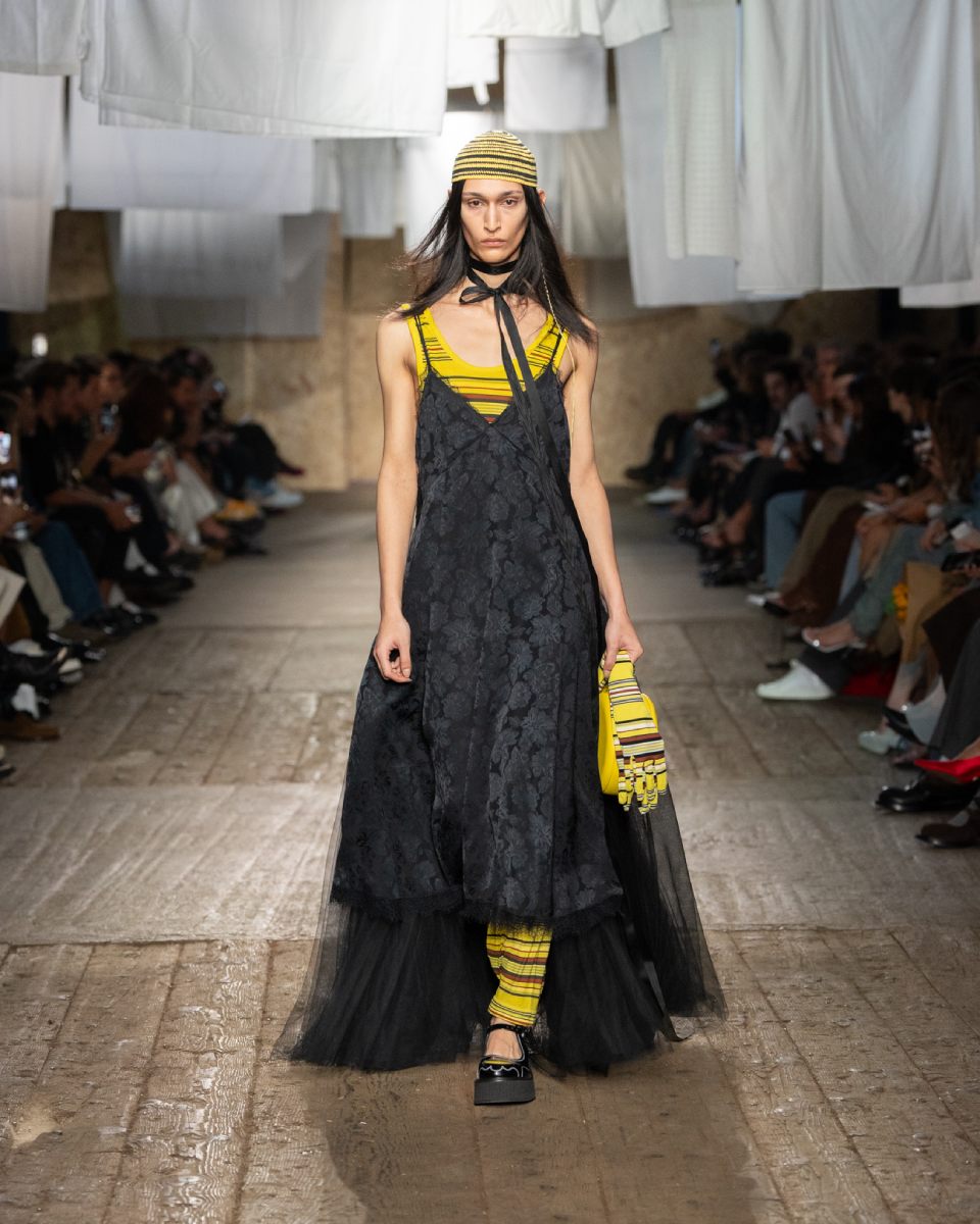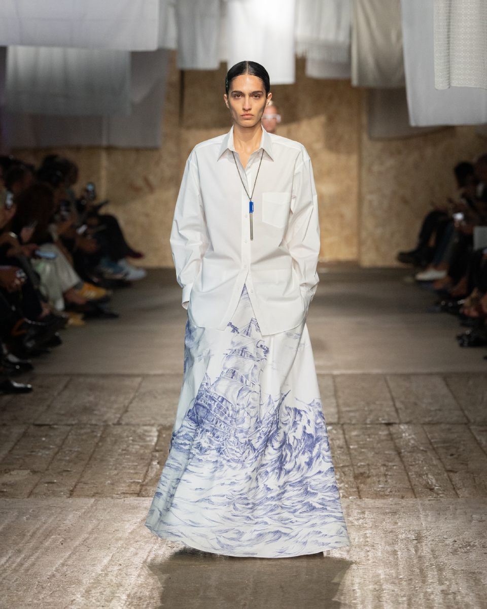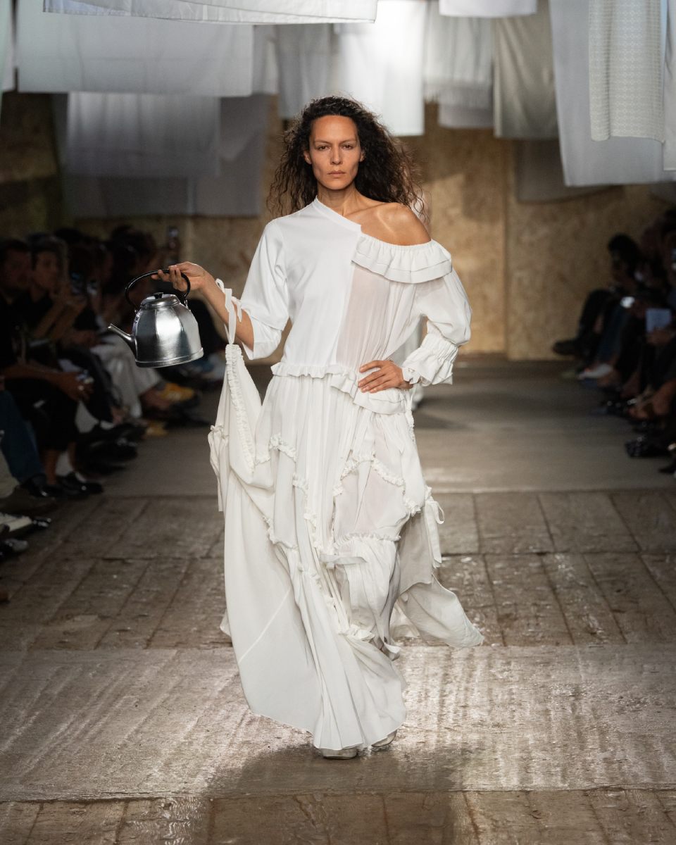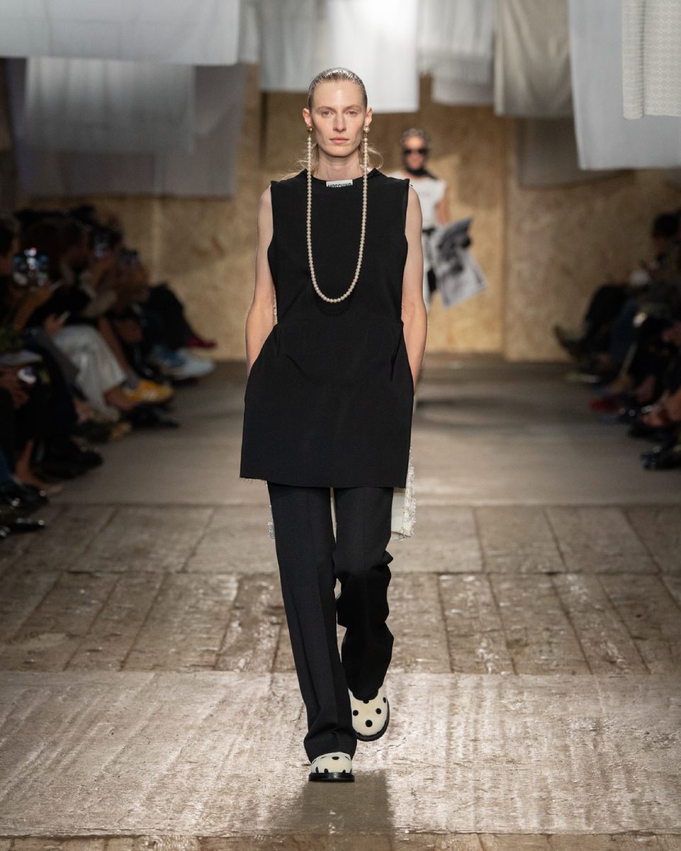 Moschino 2025 İlkbahar/Yaz Koleksiyonu, Adrian Appiolaza'nın üçüncü sezonunda, Franco Moschino’nun mirasını 21. yüzyıl izleyicisi için yeniden yorumladığı, alt kültürel moda gruplarını inceleyen bir koleksiyon olarak karşımıza çıkıyor. Beyaz görünümlerle başlayan defilede, drapeli silüetler, çizgili trikolar, dantel slip elbiseler ve Judy Blame’den ilham alınan aksesuarlar öne çıkıyor. Appiolaza'nın geniş vizyonu, moda dünyasında eğlence ve iyimserlik arayanlara cesur ve dikkat çekici bir stil sunuyor.