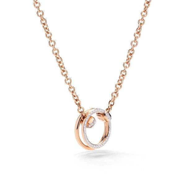 Pomellato Together mücevherleri her zaman birbirine bağlı iki elipsi simgeler, birliğin gücünü ve bir arada olmanın önemini temsil eder. İki yeni daire şeklindeki kolye, altın bağlantılarla süslenmiş elmas detaylara sahip, birliği parıltılı bir sembol olarak sunuyor. Hareketli bağlantılardan biri zincirin iki halka arasında kaymasına izin verirken, bu dokunmatik detay, aşkın özgürlüğünü ve neşesini hatırlatıyor.