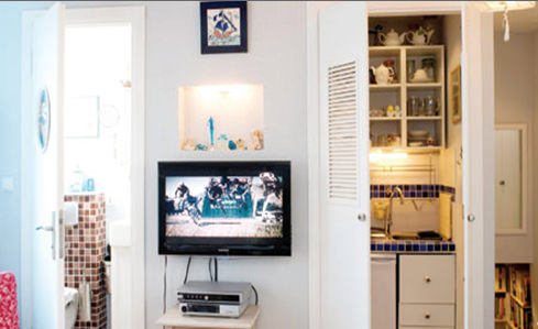 Home Art dergisinin Kasım sayısı için hazırlanan "Stüdyo Daireler" dosyasında fotoğraflanan bu evin mutfağı Kitchenette tarzına iyi bir örnek. Ev sahibesi oturma odasının köşesindeki küçücük bir alanı dekoratif kapılar ardına saklayarak hem mutfak ihtiyacını çözmüş hem de gözlerden uzaklaştırmış.Aile birliğinin ocağın tütmesiyle ilişkilendirildiği