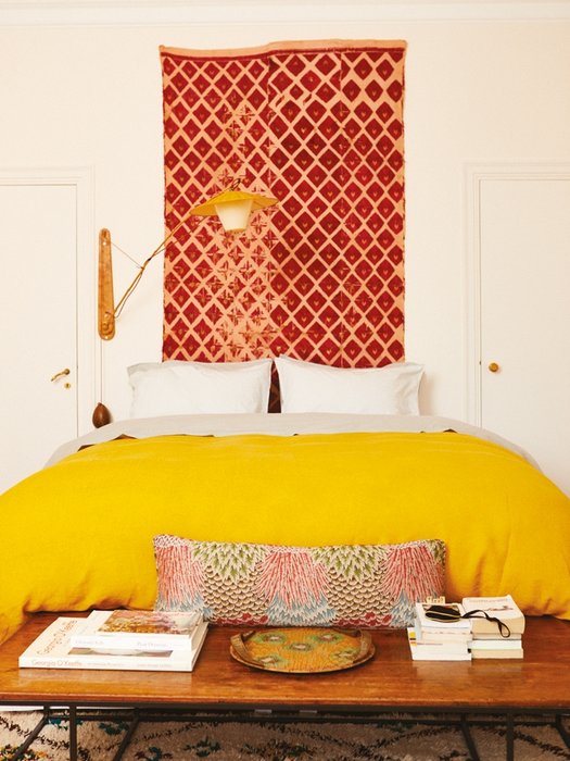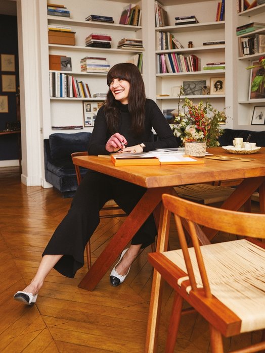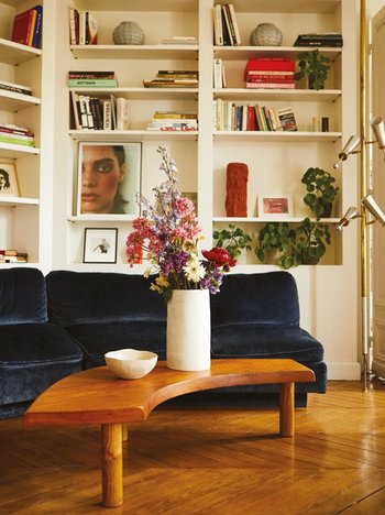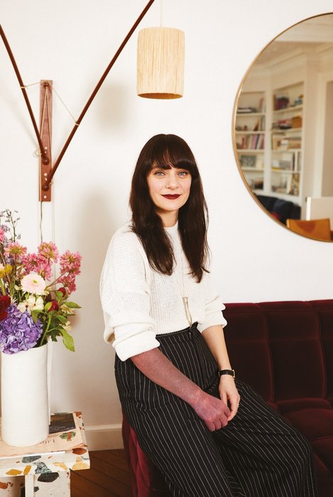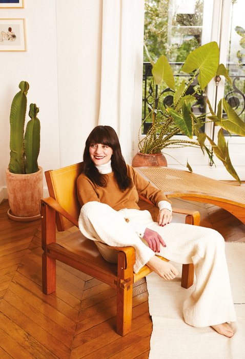 Bizi sıcak bir şekilde karşılayıp içeriye davet ederken üzerinde vintage Levi's 501 jean, Margaret Howell kaşmir triko, Chanel topuklu ayakkabılar ve Sophie Bille Brahe küpeler var. Evi, Pierre Chapo yemek masası, Paris'in meşhur müzayede evi Piasa'dan alınmış bir Igor Rodrigues şezlong ve bir George Nakashima sehpa gibi parçaların dahil olduğu, yüzyıl ortası döneme ait hoş bir mobilya seçkisiyle döşenmiş. Vintage kadife kanape; yanındaki Rupprecht Skrip aplikler, Mathilde Martin imzalı vazo, Harley Weir, Ben Barlow ve Jason Brinkerfoff'a ait eserler ile bir arada göz kamaştırıcı bir tablo oluşturuyor. "Bir parçayı satın alırken sadeceo nesneyi değil, biraz tarih ve sihir de almış oluyorsunuz'"diyor.