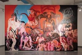 Wynnie Mynerva, ABD'deki ilk kişisel müze sergisinde yeni bir çalışma grubunu ilk kez sergiliyor. Lobby Gallery için mekana özel bir enstalasyon geliştiren Mynerva, New Museum'da şimdiye kadar sergilenen en büyük tablo ve sanatçının kendi vücudundan yaratılan heykelsi bir öğenin yanı sıra galeriyi kapsayan bir tablo aracılığıyla, Havva'nın İncil'deki köken hikayesini yeniden canlandırıyor. 1992'de Peru, Lima'nın varoşlarında doğan Mynerva, cinsiyet, cinsellik, ırk ve sosyal sınıfa dayalı şiddetle dolu bir ortamda büyüdü. Hem travmalarına hem de arzularına yanıt veren sanatçı, katartik intikam ve özgürleşme vizyonları yaratmasıyla tanınıyor. Büyük ölçekli resimleri, kategorize edilmeyi, tüketilmeyi veya kontrol edilmeyi reddeden, soyutlamanın eşiğindeki bedenleri tasvir ediyor. Radikal performansları ve vücut modifikasyonları, cinsel ihlali toplumsal dönüşüme giden bir yol olarak varsayıyor. Bu sergide Mynerva, Havva ile Lilith arasındaki karşılaşmayı dişileştirilmiş bedenler arasındaki ilk ittifak olan The Original Riot olarak tasavvur ederek tüm İbrahimi dinlerin kuruluş öyküsünü yeniden anlatıyor. Yetmiş fit uzunluğundaki tablo, ataerkil güce karşı yaptıkları anlaşmanın bir simgesi olarak Havva'nın Lilith'e Adem'in kaburga kemiğini verdiği bir sahneyi tasvir ediyor. Sergi, 17 Eylül'e kadar New Museum'da izleyicisi ile buluşuyor.