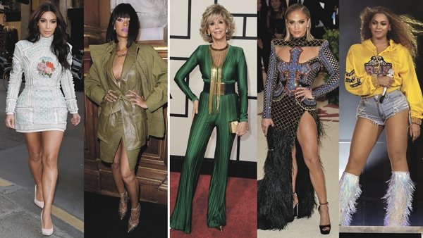 Soldan sağa: Kim Kardashian, Paris, 2014; Rihanna, Balmain Sonbahar 2014 defilesinde; Jane Fonda, Grammy Ödülleri, 2015; Jennifer Lopez Met Gala'da, 2018; Beyoncé, Coachella Valley Music & Arts Festival'inde sahnede, 2018