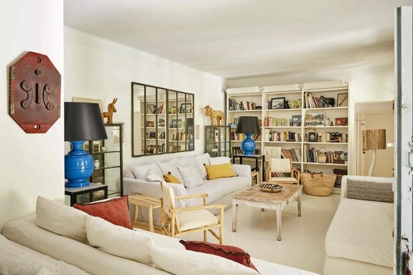 Beyaza boyalı duvarlar, kırsal ambiyansa zarafet kaktan keten perdeler, ahşap masa ve sandalyeler, hasır sepetler, de la Fressange'ın Fas, Tunus ve Hindistan seyahatlerinden ve yerel pazarlardan topladığı eklektik objeler arasında. Evdeki tüm bu çabasız detaylar kırmızı, koyu sarı ve mavi tonlarıyla tamamlanarak rafine bir stil oluşturuyor.