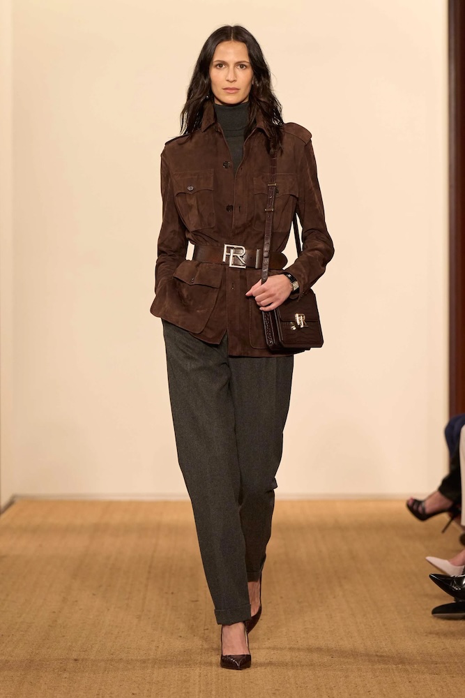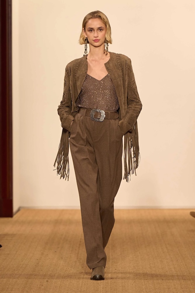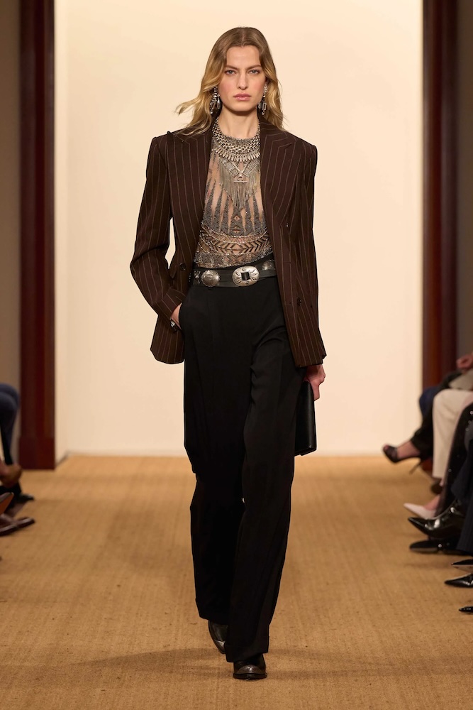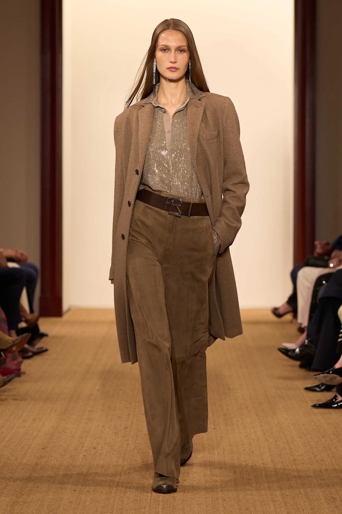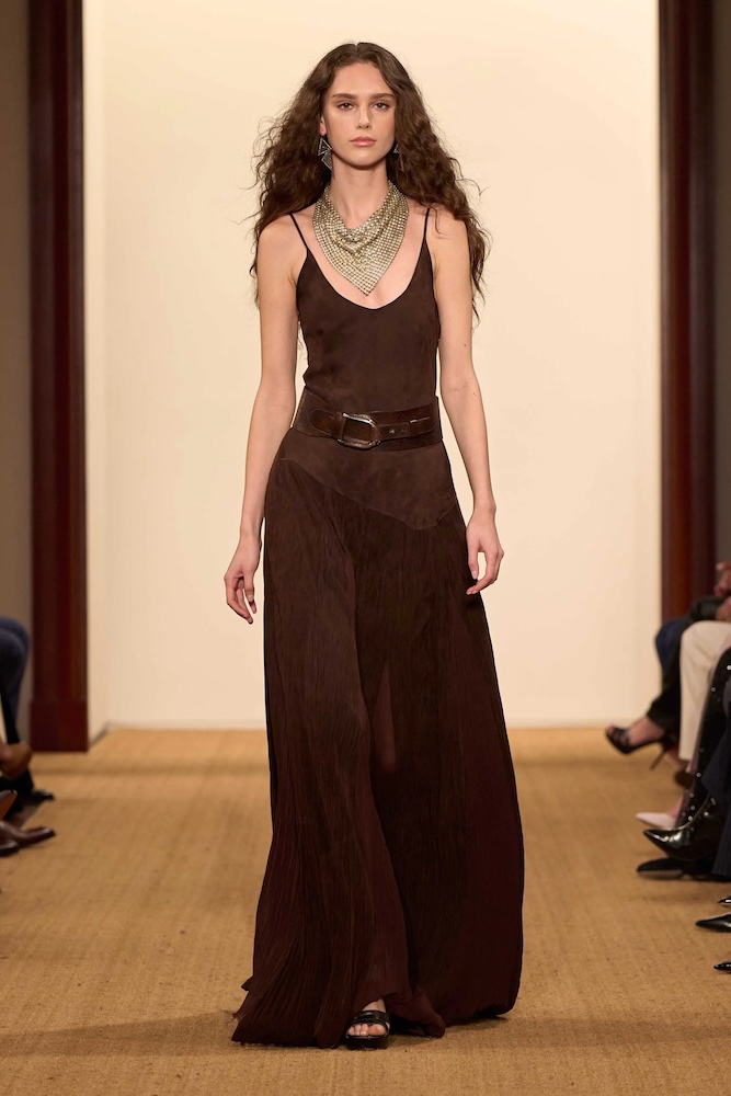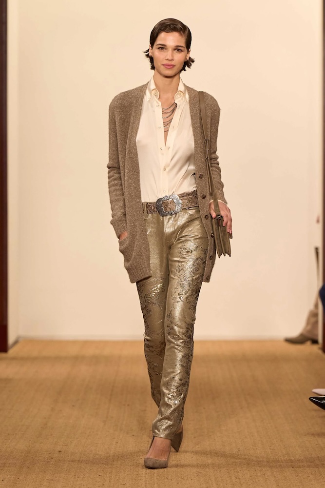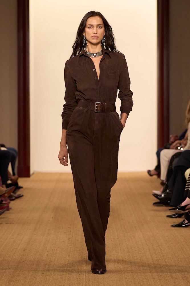 45 farklı görünümün yer aldığı defilenin renk skalasında bejin yanı sıra, karamel, sütlü kahverengi, maun, metalik ve siyah bulunuyor. Yün, ipek krep, süet, kaşmir kumaşlara klasik Ralph Lauren şıklığını vurgulayan tokalı kemerler, devasa kovboy şapkalar ve zamansız çantalar eşlik ediyor. Işıltılı ve boyundan bağlamalı elbise, kruvaze siyah smokin, deri kalem etek, Irına Shayk’ın taşıdığı maun rengi süet tulum, safari ceket, yün pantolon tasarımları ve püskül detaylarıyla Ralph Lauren zamansızlığını zarafetle harmanlıyor.