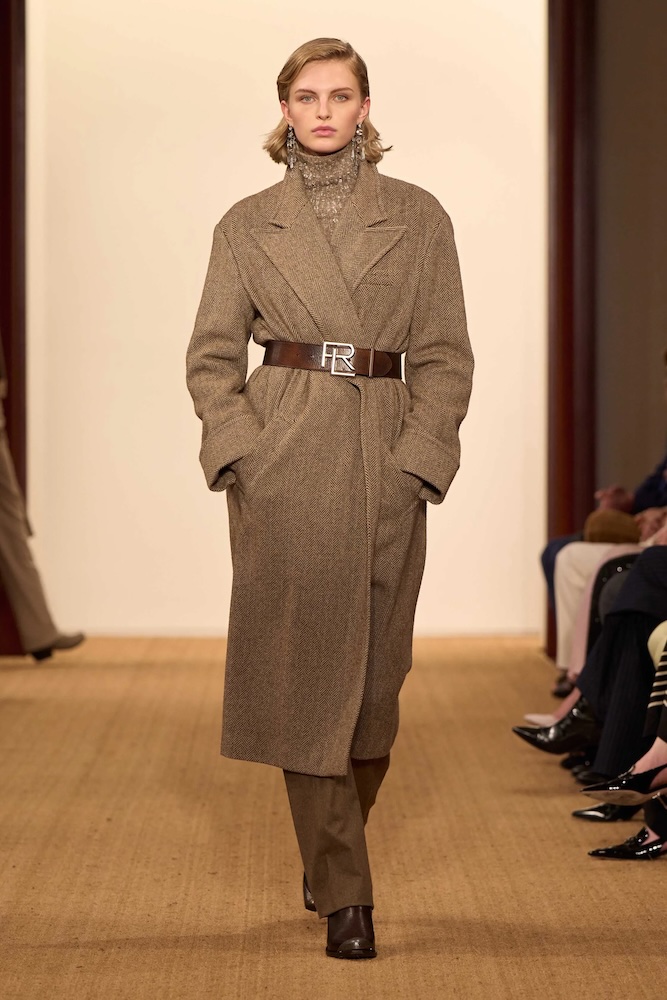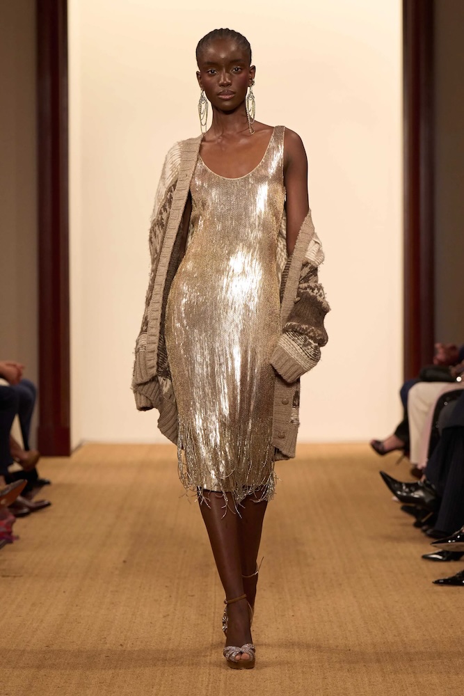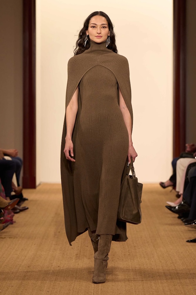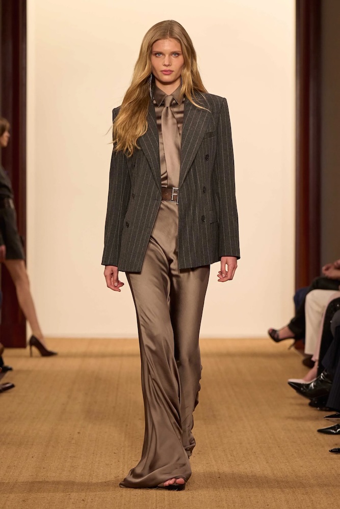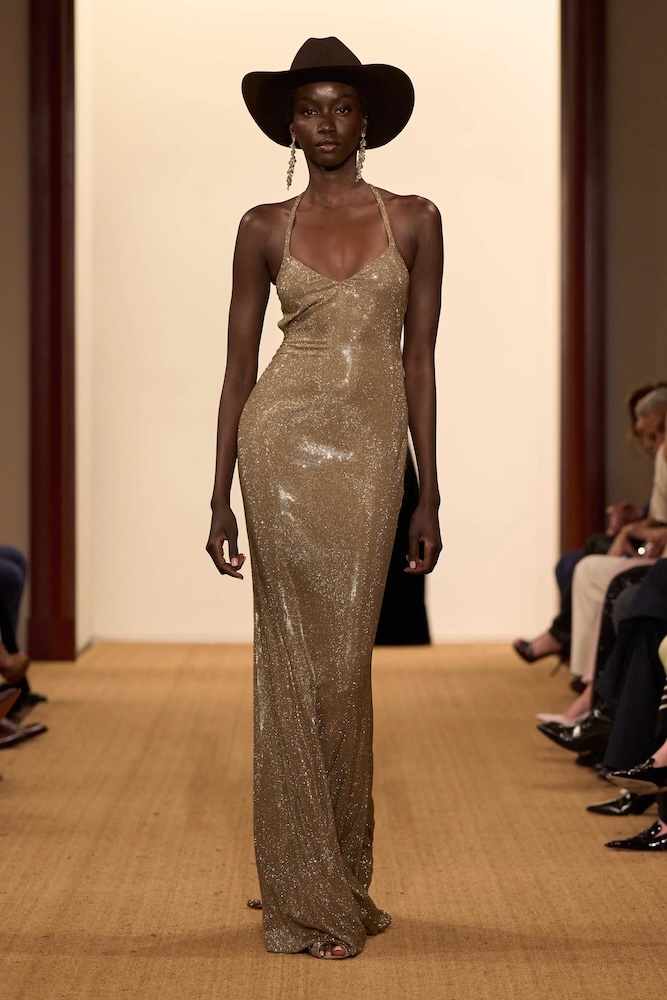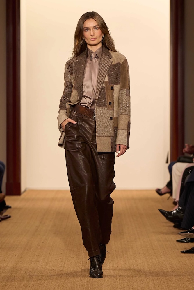 45 farklı görünümün yer aldığı defilenin renk skalasında bejin yanı sıra, karamel, sütlü kahverengi, maun, metalik ve siyah bulunuyor. Yün, ipek krep, süet, kaşmir kumaşlara klasik Ralph Lauren şıklığını vurgulayan tokalı kemerler, devasa kovboy şapkalar ve zamansız çantalar eşlik ediyor. Işıltılı ve boyundan bağlamalı elbise, kruvaze siyah smokin, deri kalem etek, Irına Shayk’ın taşıdığı maun rengi süet tulum, safari ceket, yün pantolon tasarımları ve püskül detaylarıyla Ralph Lauren zamansızlığını zarafetle harmanlıyor.